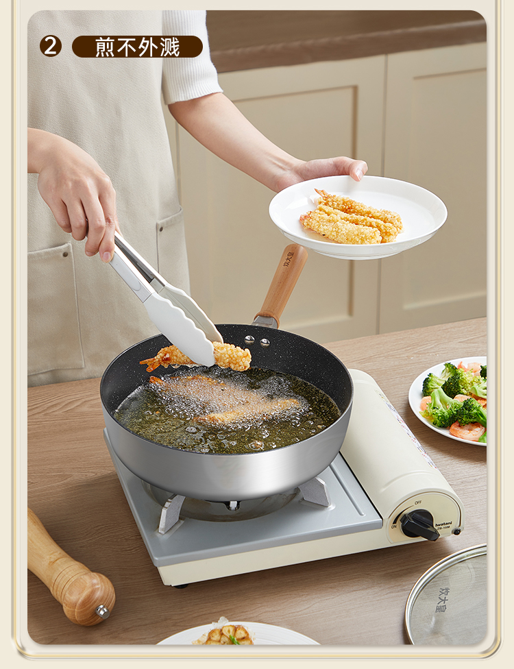 1、轻油不粘一锅多用加深锅高,锅底聚油不跑油煎炒更省油,不糊底。