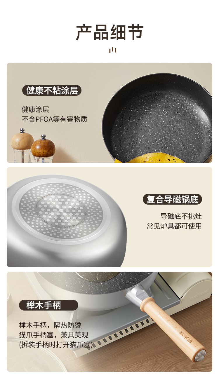 2、麦饭石色不粘锅,不粘锅下厨更方便。新手轻松撑控厨房。