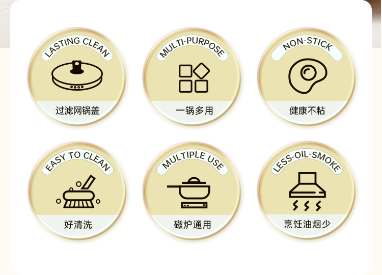 3、导流口+过滤网锅盖轻松过滤汤汁,不粘锅好清洗,省时更省力节省餐后清洗时间。