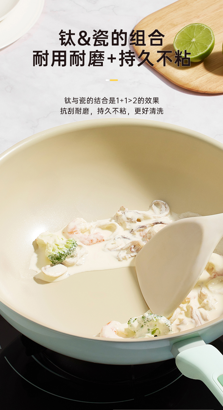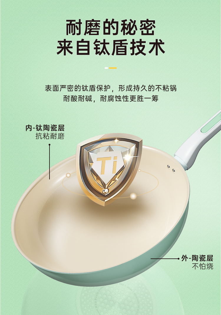 3、钛与瓷的结合是1+1>2的效果抗刮耐磨,持久不粘,更好清洗。