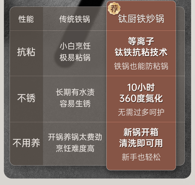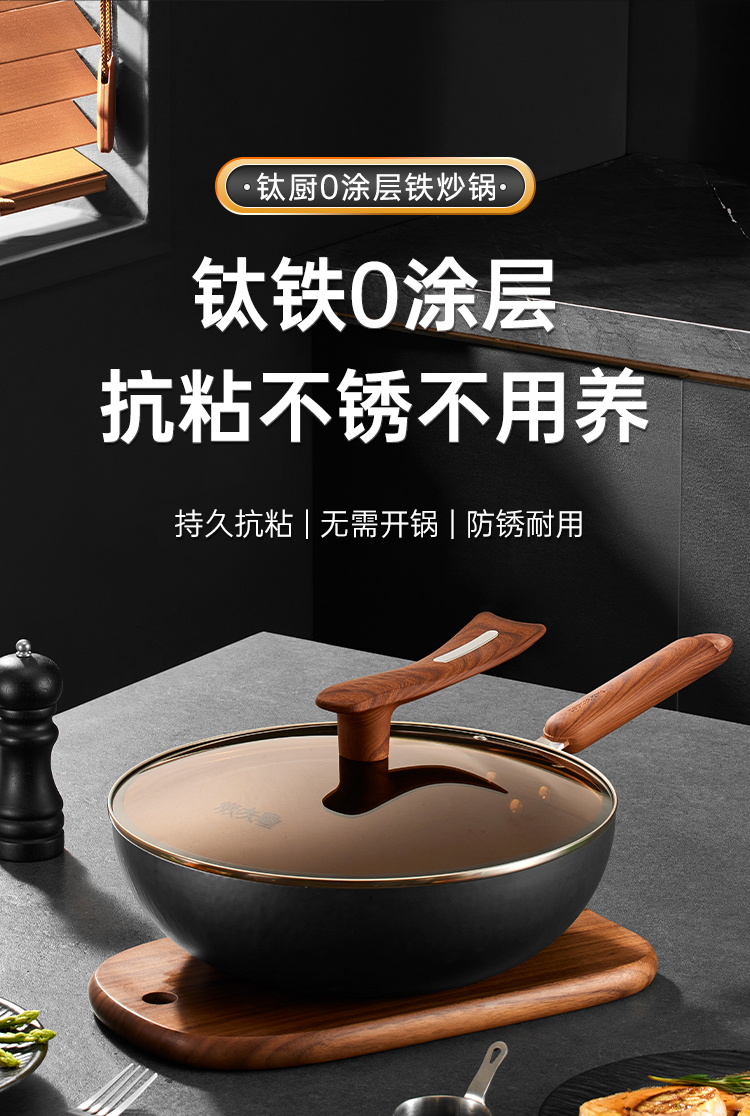 1、钛铁0涂层抗粘不锈不用养,持久抗粘无需开锅防锈耐用。