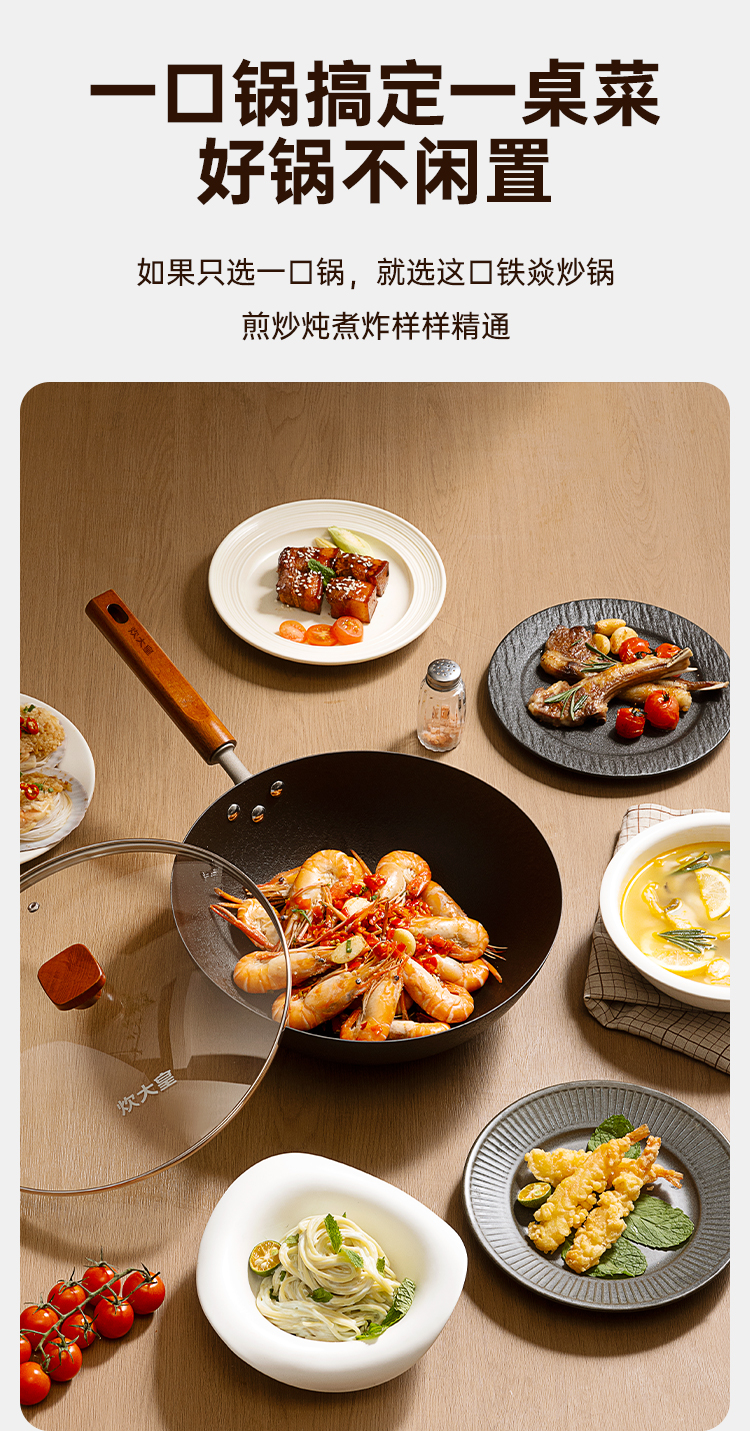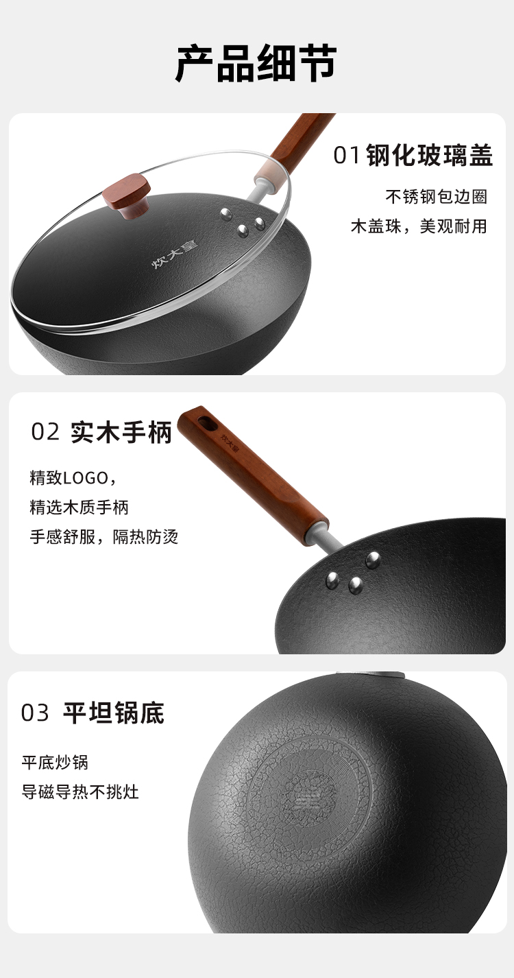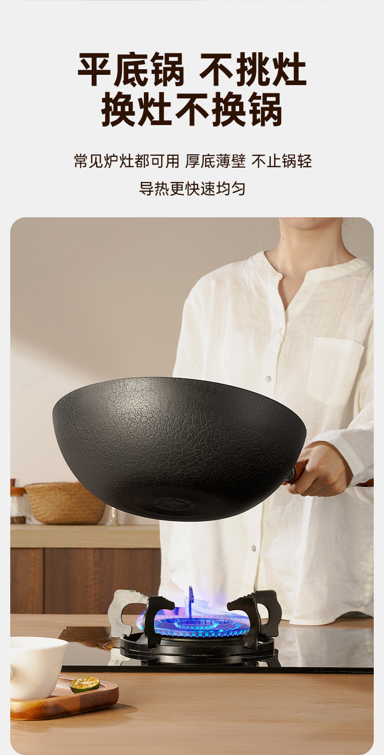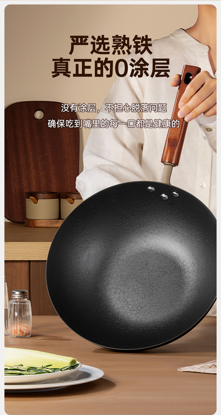 1、严选精铁真正的0涂层铁焱炒锅,疏油纹路,轻便好掂。