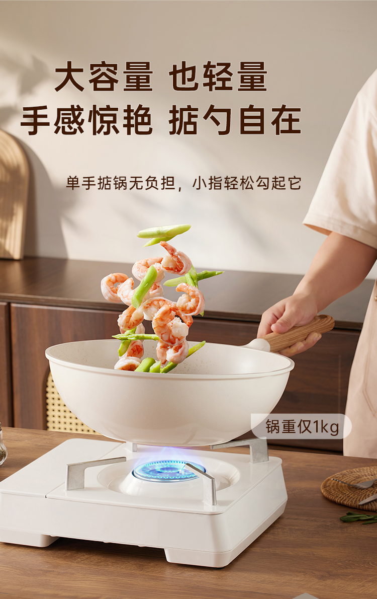3、大容量 也轻量手感惊艳 掂勺自在,单手掂锅无负担,小指轻松勾起它。