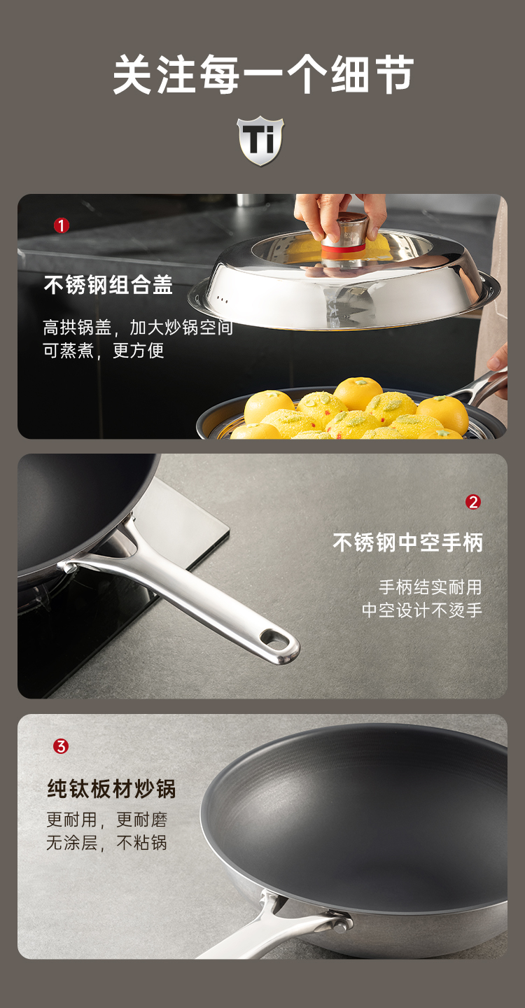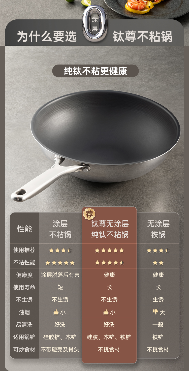 1、0涂层钛健康无重金属|物理不粘纯钛不粘更健康。