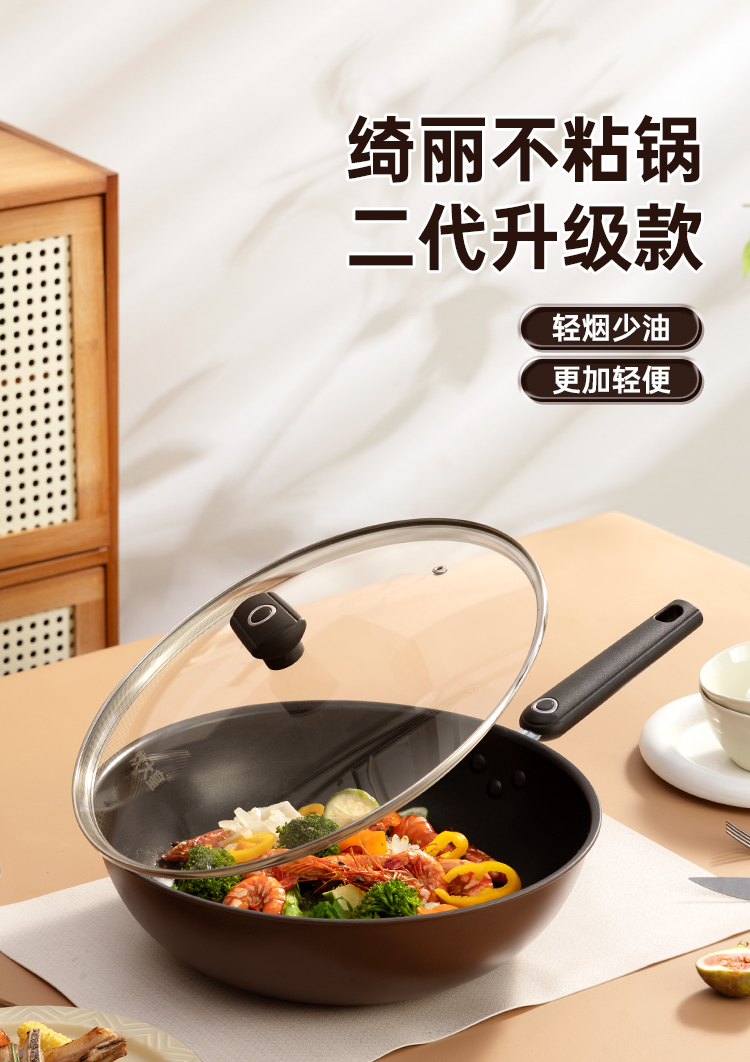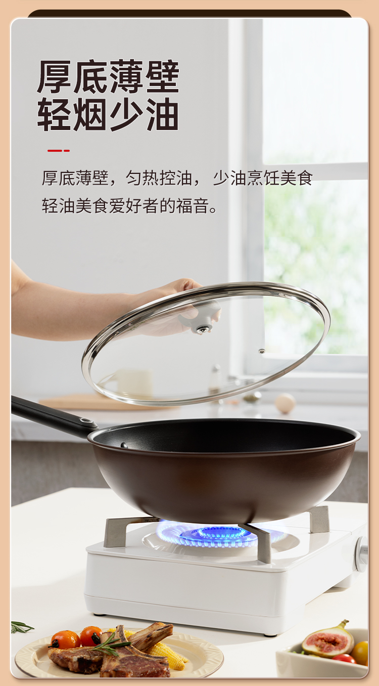 1、锅身升级R角弧度翻炒更丝滑不易洒,锅胚多次打磨锅身减轻至约970g,厚底薄壁,匀热控油,少油烹饪美食轻油美食爱好者的福音。