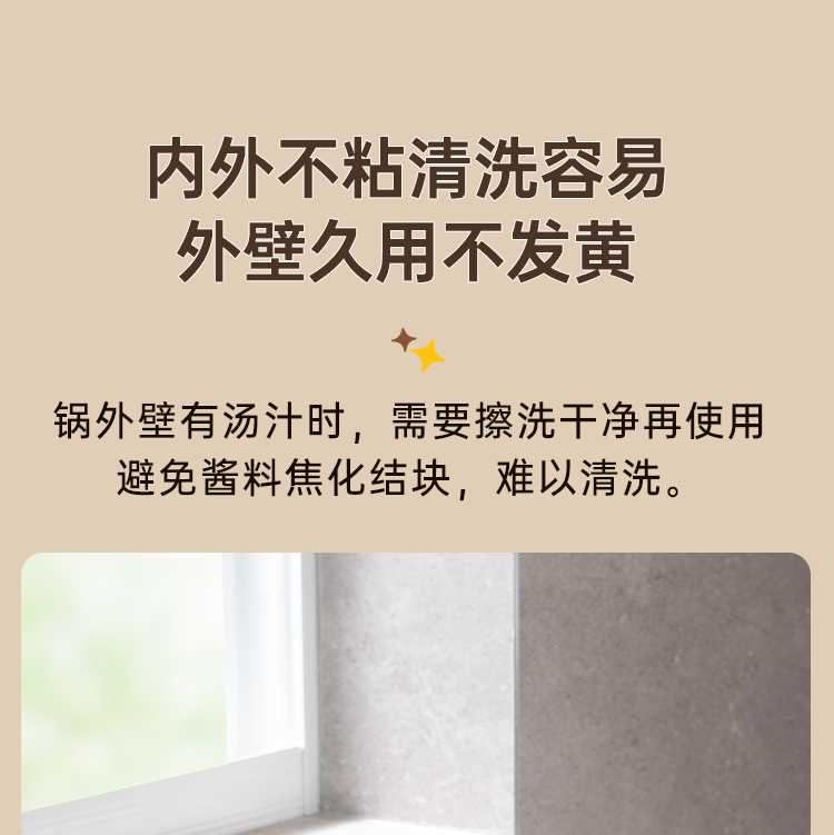 3、内外不粘清洗容易外壁久用不发黄,电胶木手柄隔热防烫握感舒适。