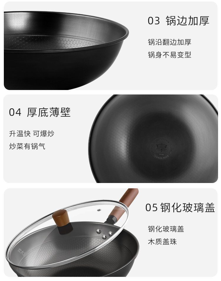 1、玄铁精铁锅铁铲任意炒,蜂巢纹路健康0涂层。