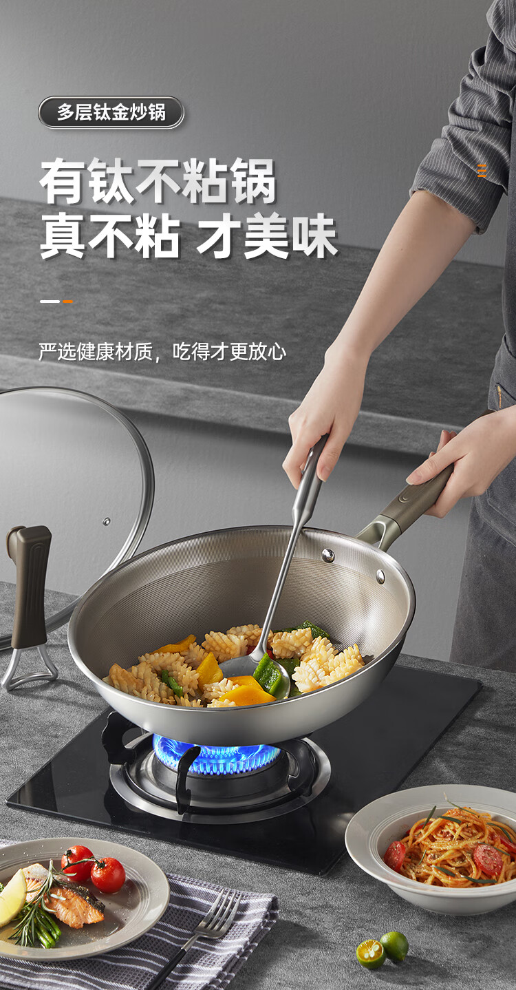 1、纯钛物理不沾无涂层钛金健康不粘锅
