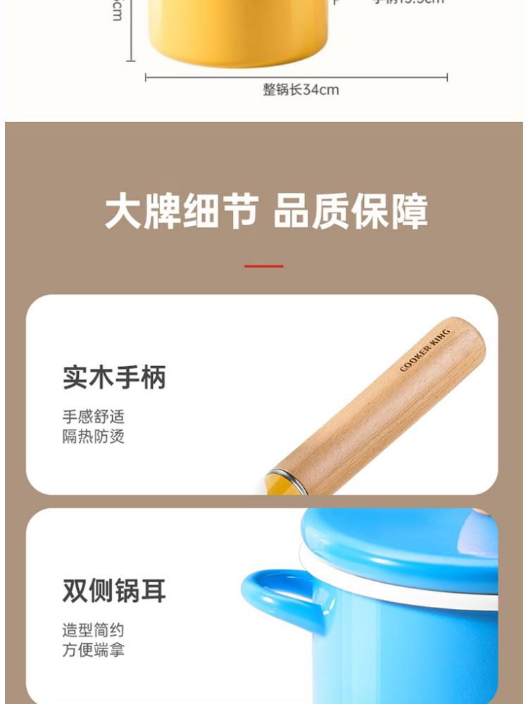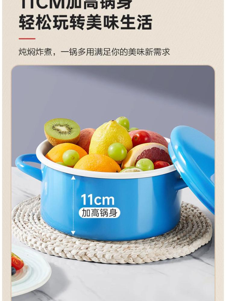 3、多种炉灶均可使用,大小厨房烹饪游刃有余,锅身内外均为搪瓷材质,内刷不伤锅,外刷不掉色,清洗安心无忧。
