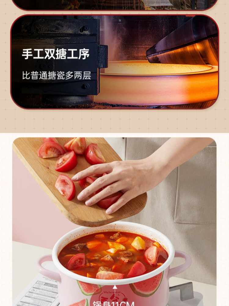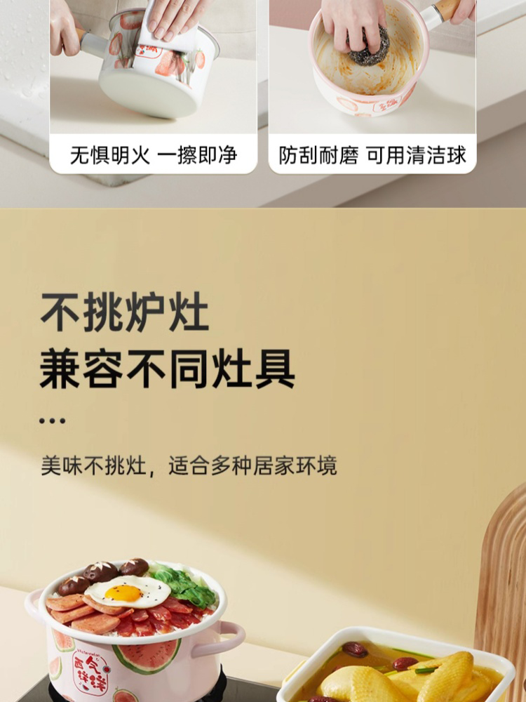 3、内刷不伤锅,外烧不变黑,美锅不娇气,炉灶通用不惧明火、烹饪无小事、细节见匠心。