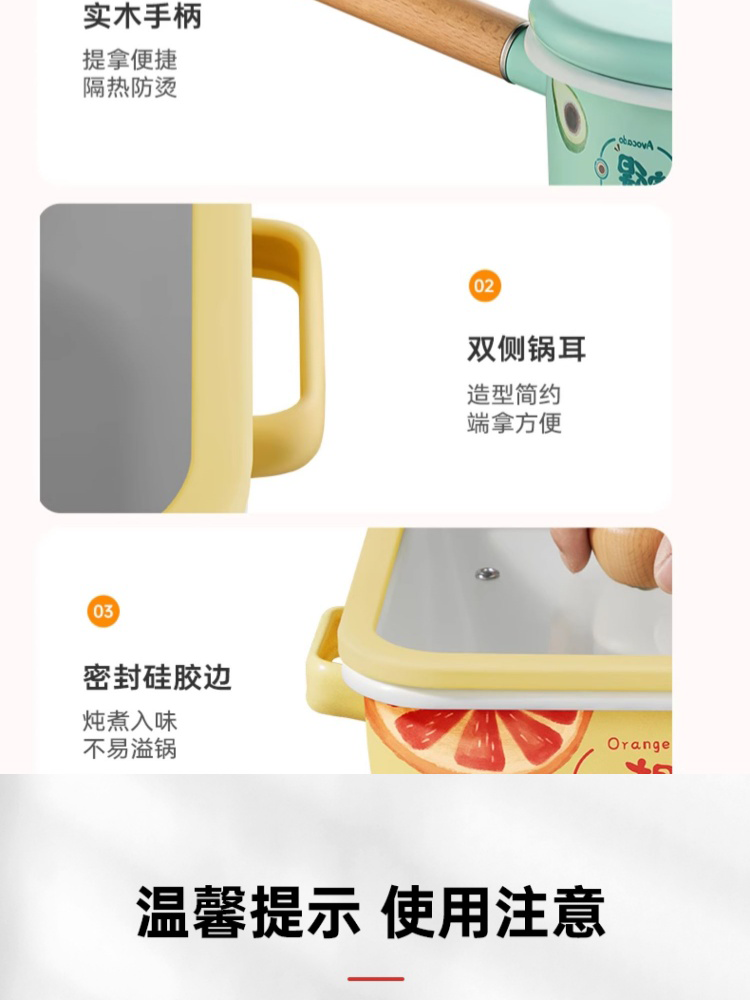3、内刷不伤锅,外烧不变黑,美锅不娇气,炉灶通用不惧明火、烹饪无小事、细节见匠心。