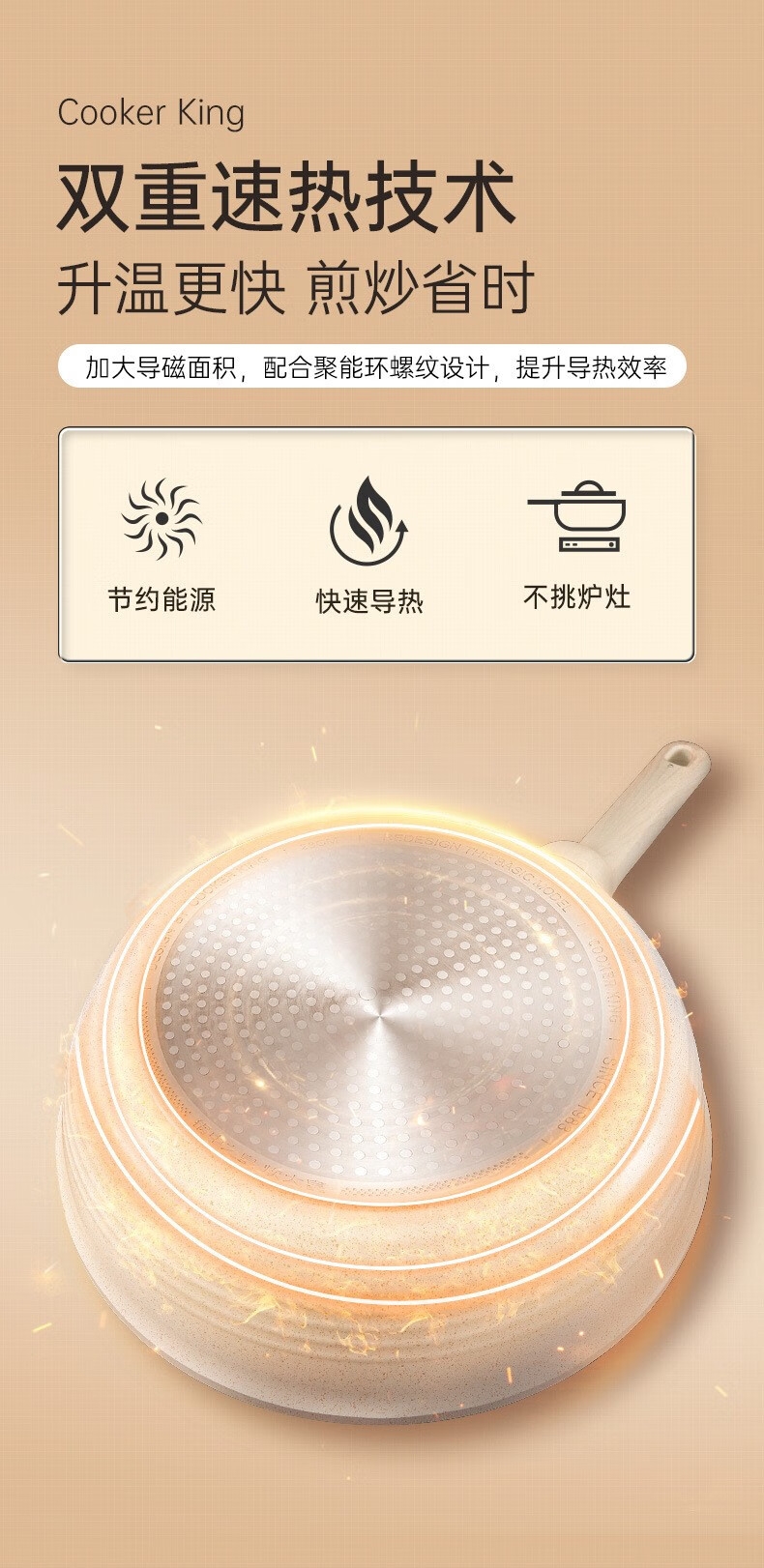 4、双重速热技术升温更快 煎炒省时,加大导磁面积,配合聚能环螺纹设计,提升导热效率
