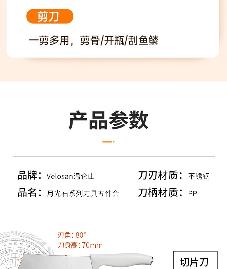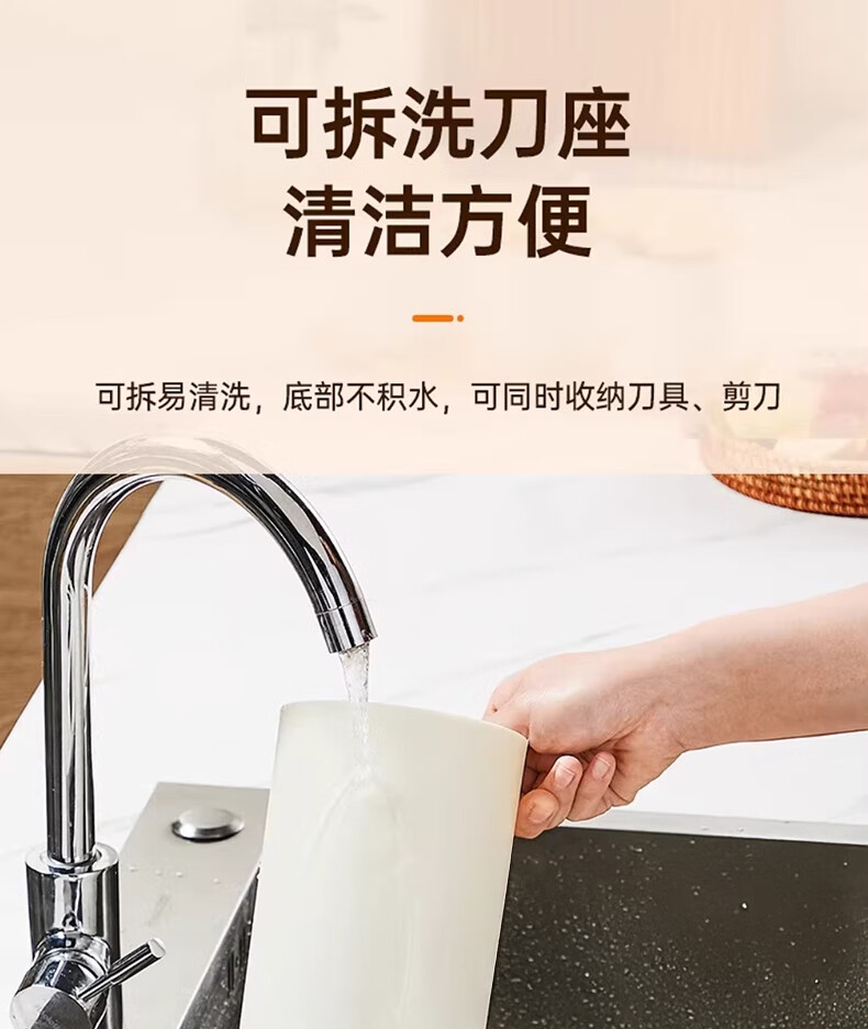 【材质】不锈钢+PP 【规格】 切片刀、厨师刀、水果刀、剪刀、收纳底座