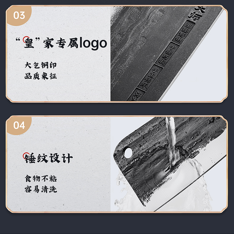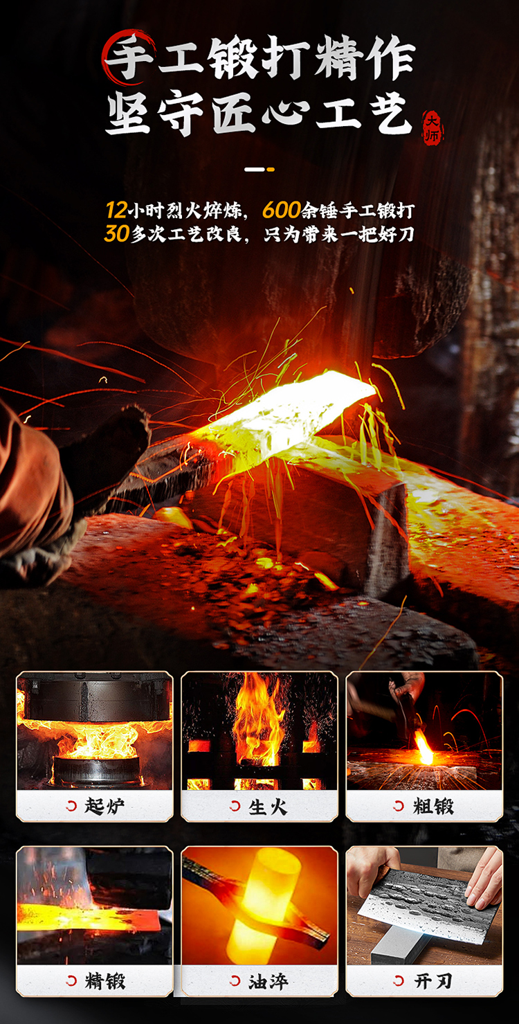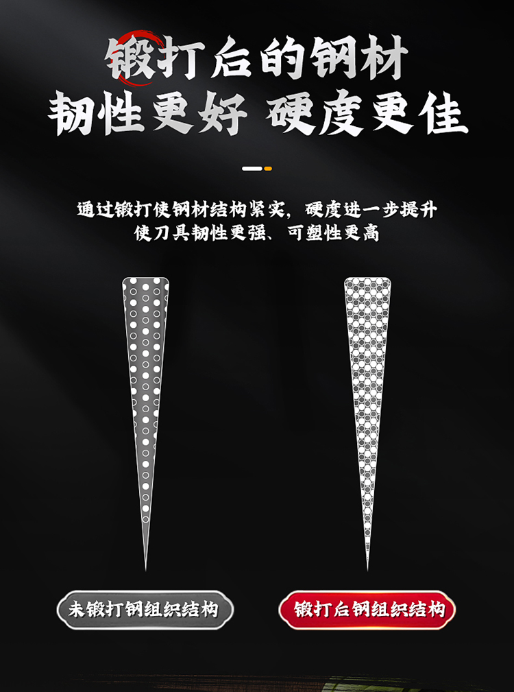 1、手工匠心锻打,坚韧锋利,助力厨房切配,锻打后的钢材韧性更好,硬度更佳。