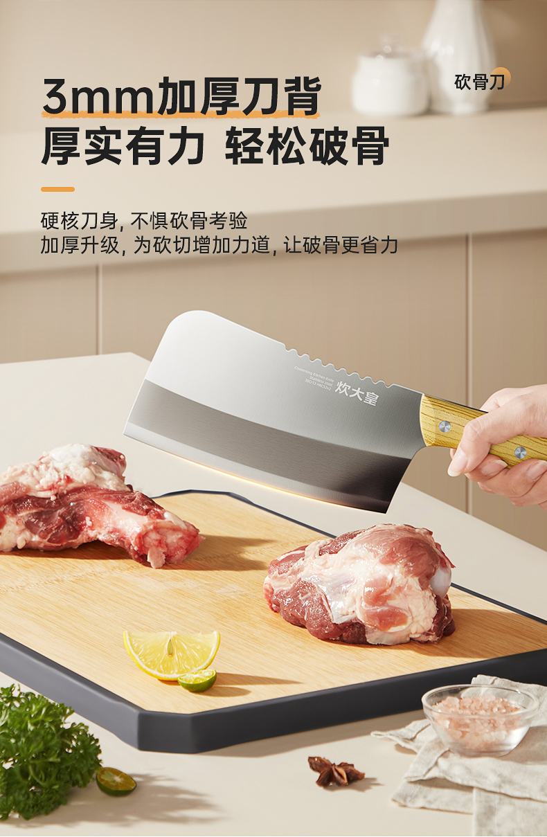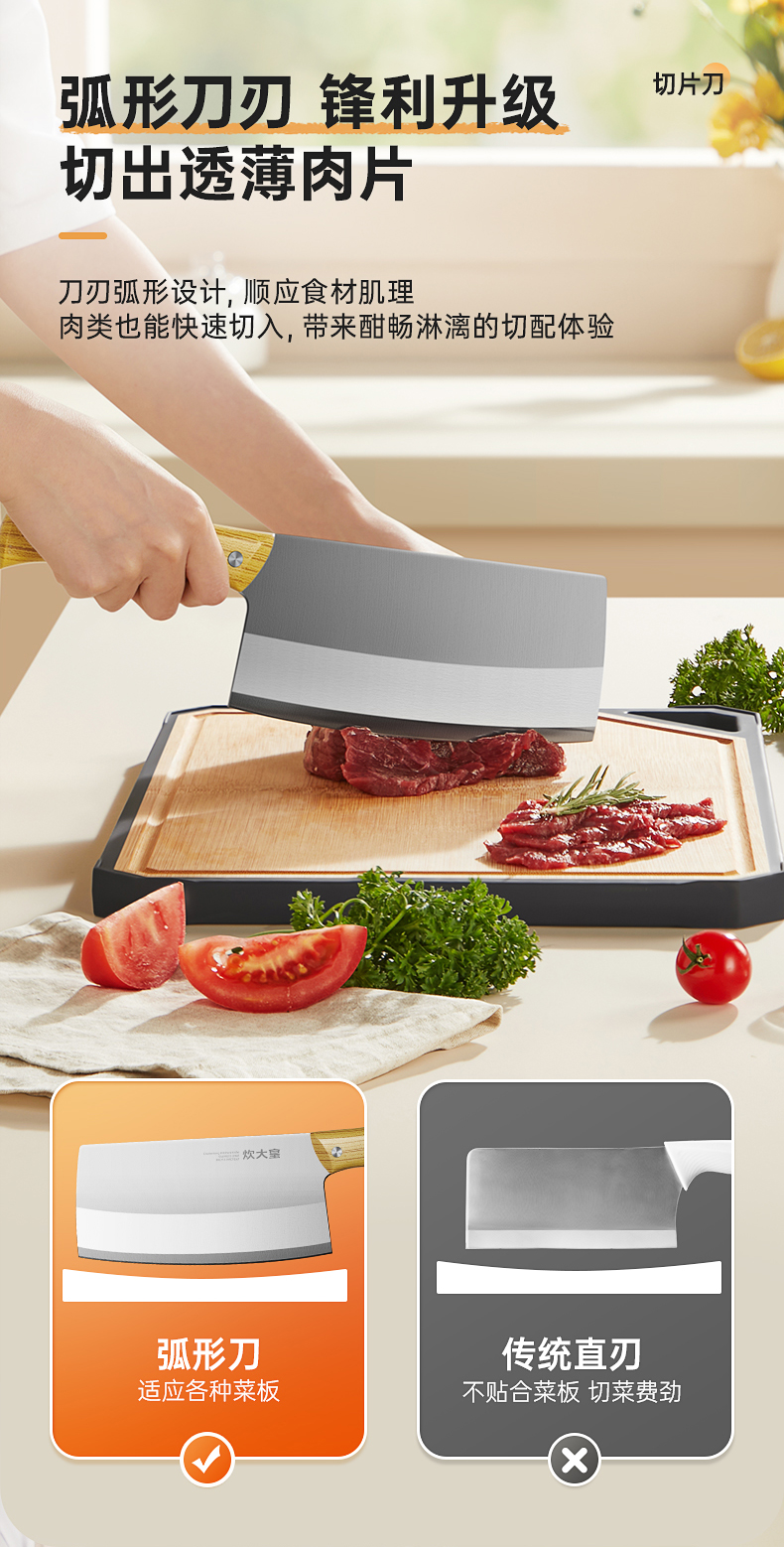 2、精湛工艺打磨,提升刀刃锋利度手起刀落,瞬间片开食材,紧锁食材汁水。
