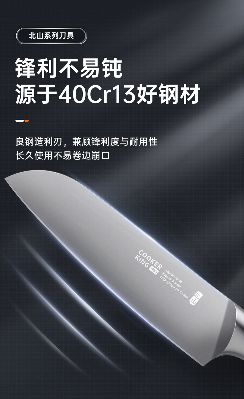 3、锋利不易钝源于40Cr13好钢材,手工湿式水磨开刃,刃口锋利升级让切配比你想象的更畅快。