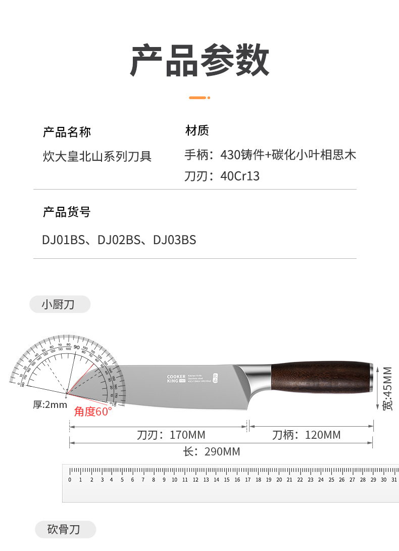 材质:手柄:430铸件+碳化小叶相思木/刀刃:40Cr13