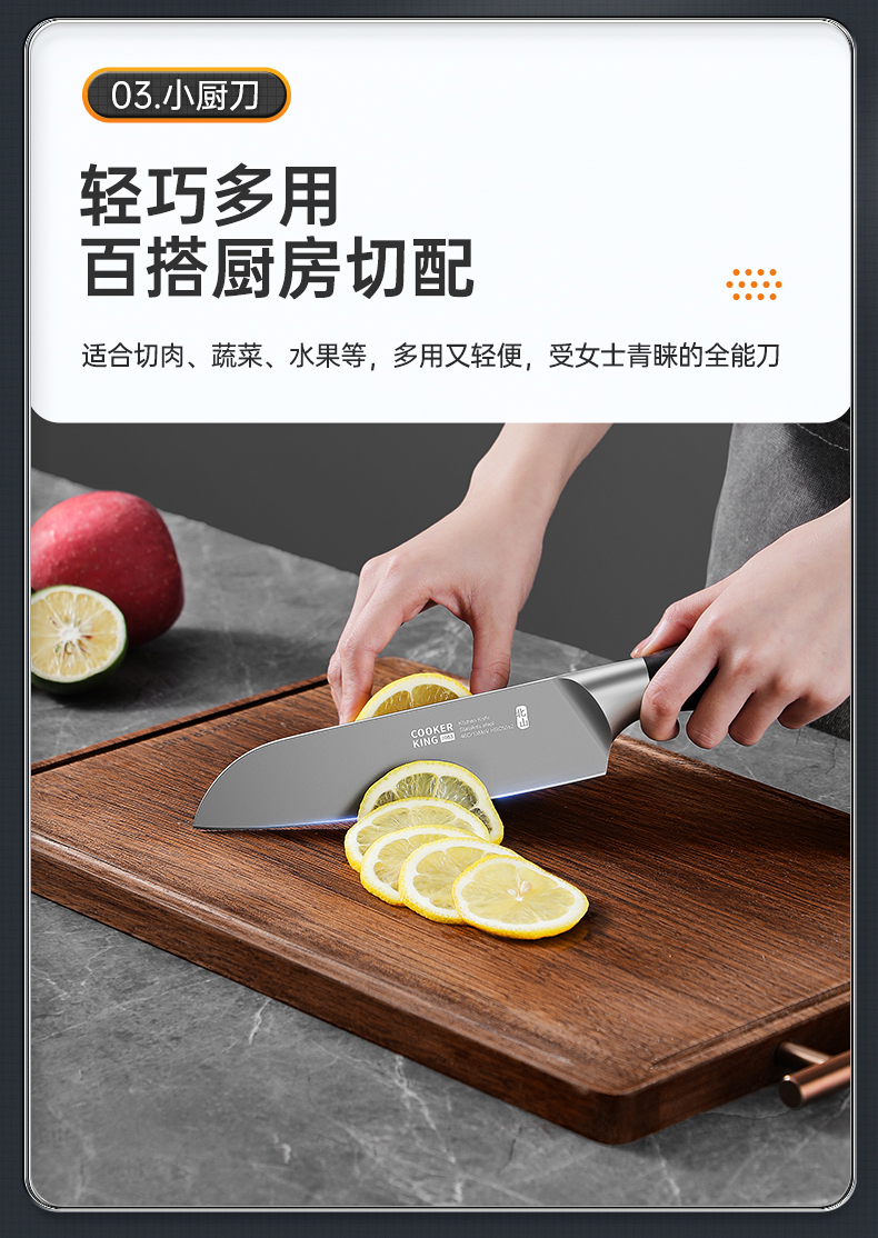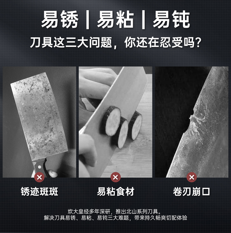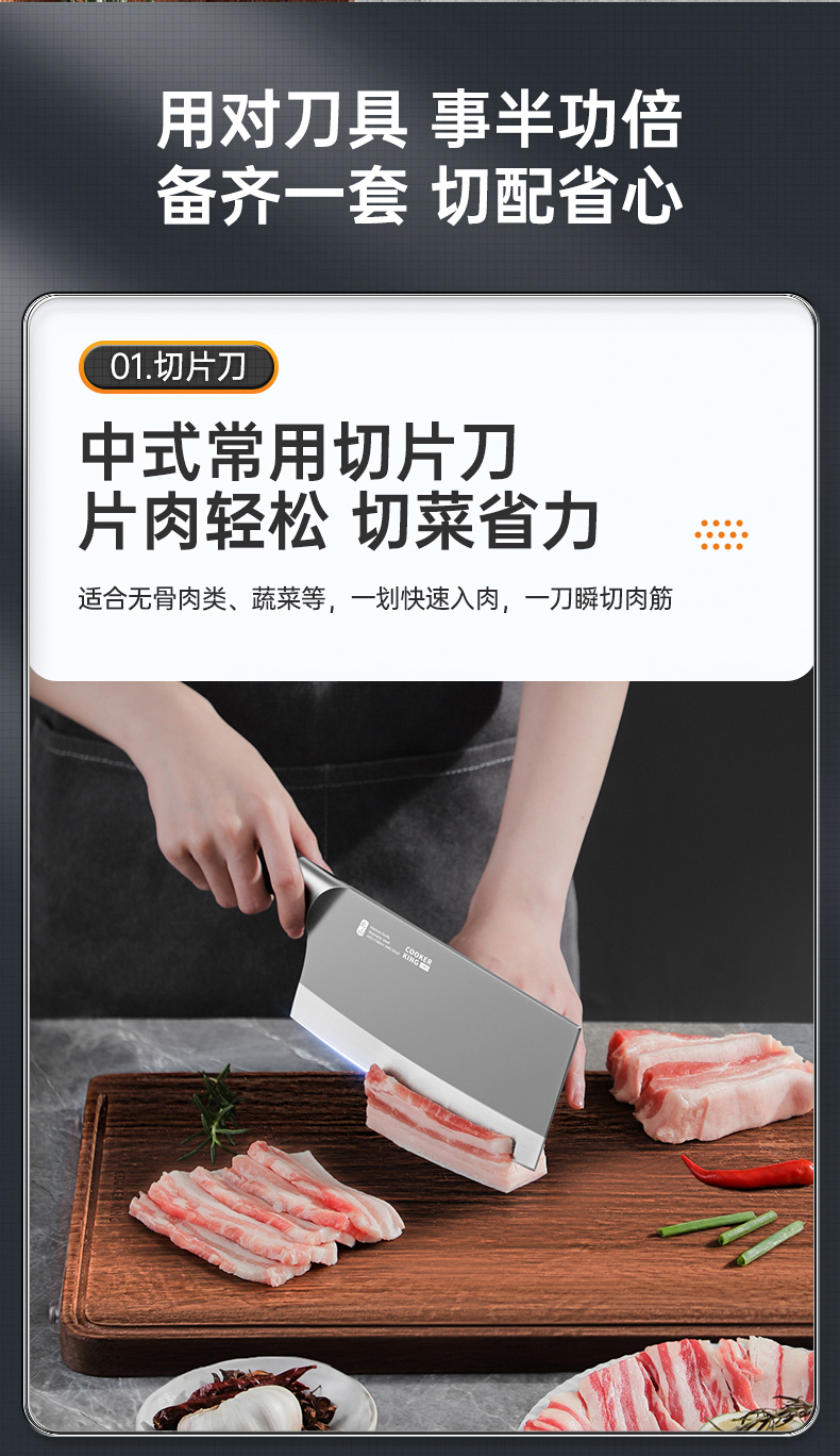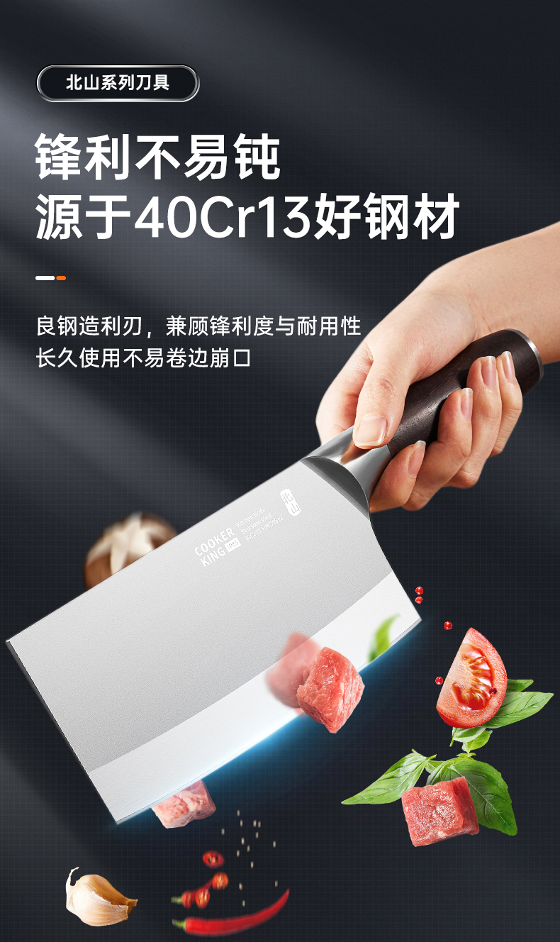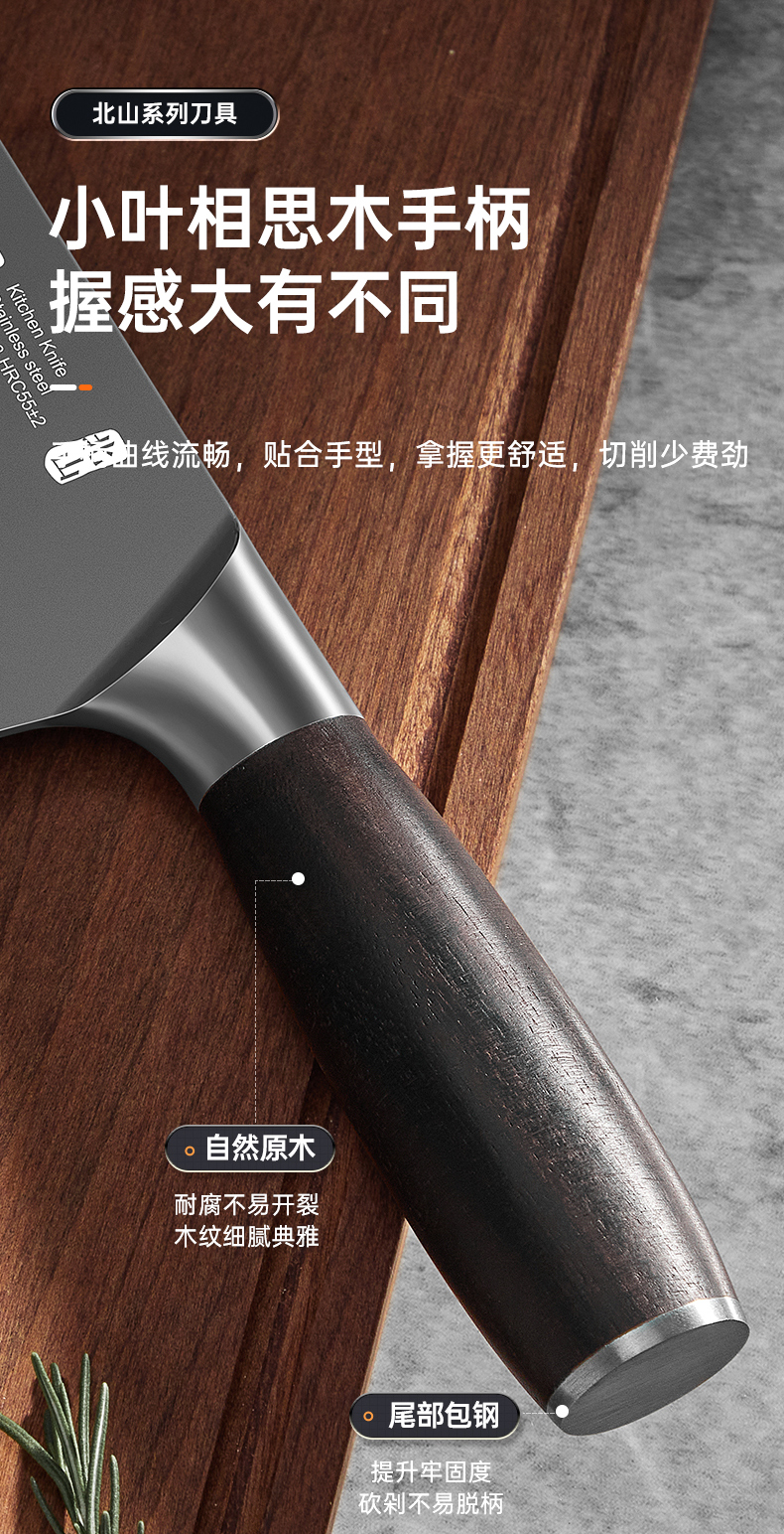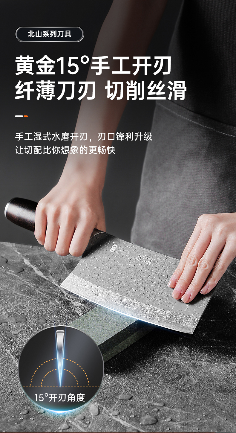 3、锋利不易钝源于40Cr13好钢材,手工湿式水磨开刃,刃口锋利升级让切配比你想象的更畅快。