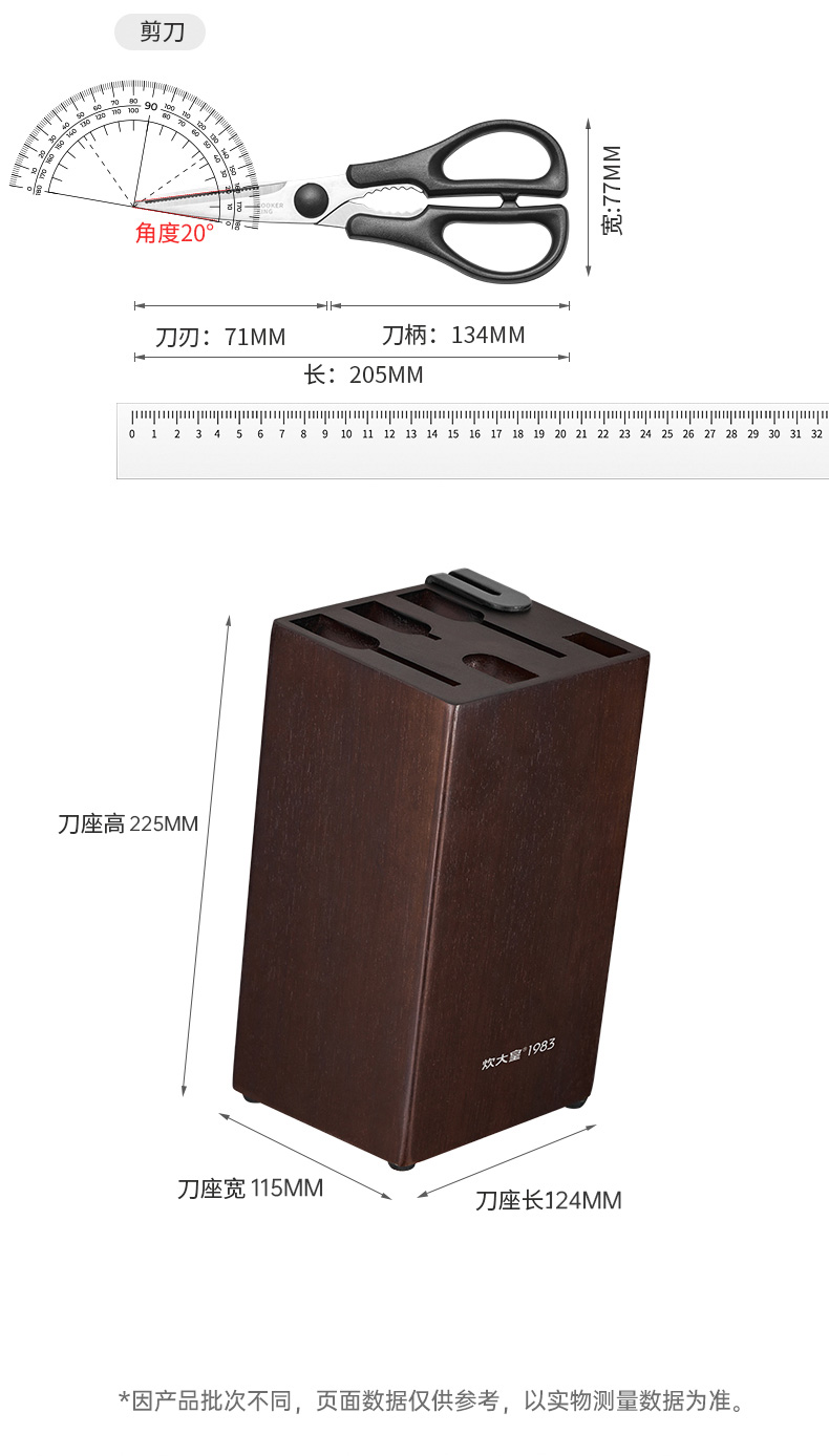 规格:砍骨刀:170*120*84mm/切片刀180*120*84mm/小厨刀:170*120*45mm/水果刀:115*105*30mm/剪刀:71*134*77mm/刀座:225*115*124mm