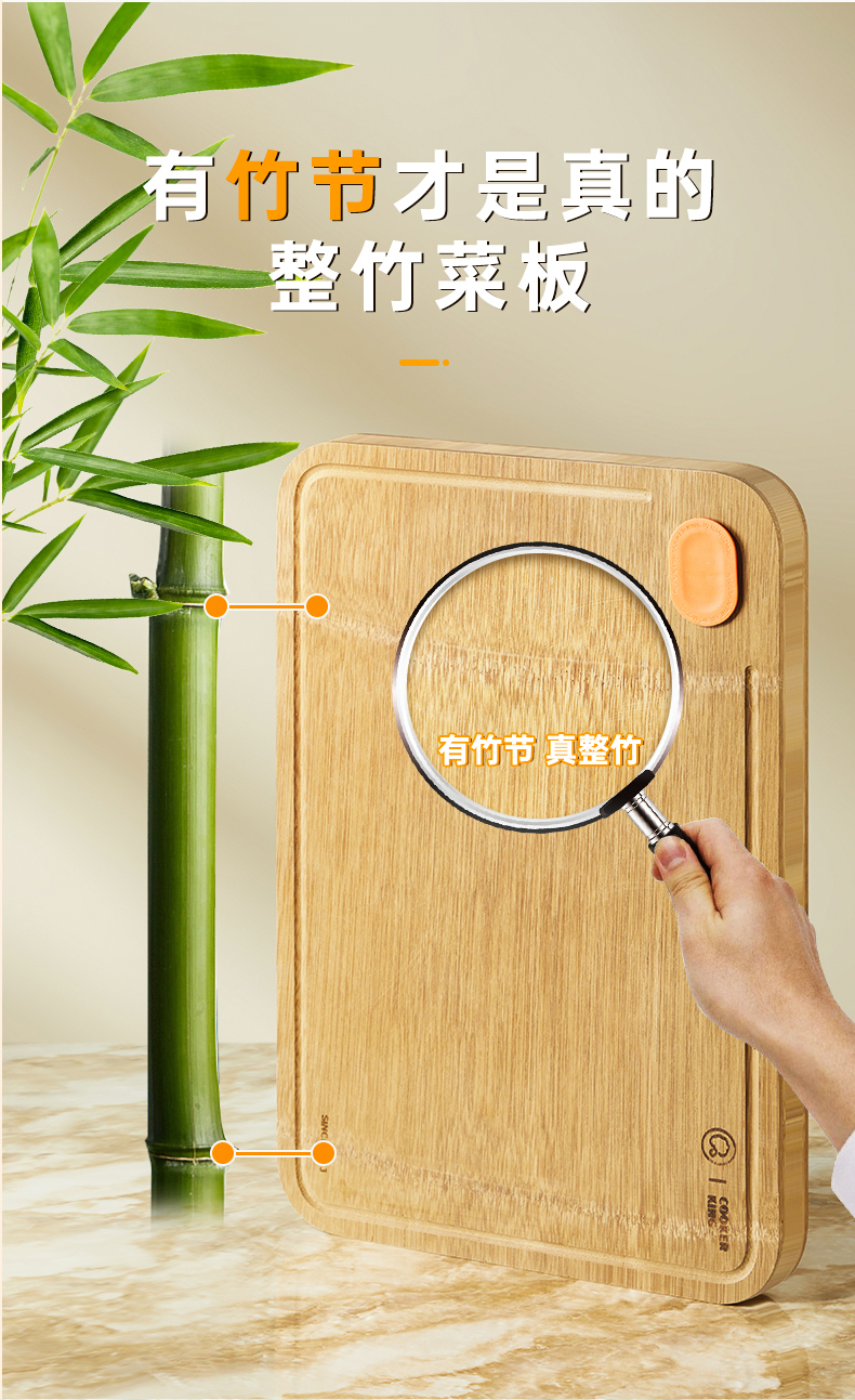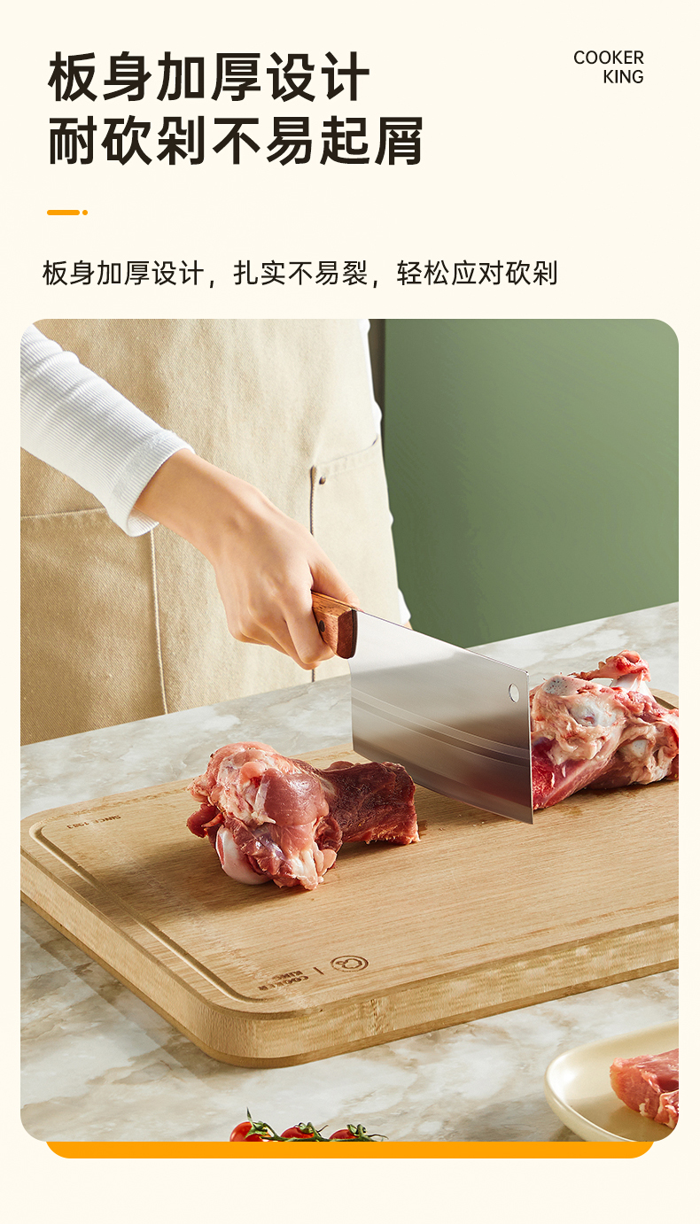 2、甄选上等原生态成年高山楠竹质地细密,不易吸水厚实耐用,板身加厚设计,扎实不易裂,轻松应对砍剁。