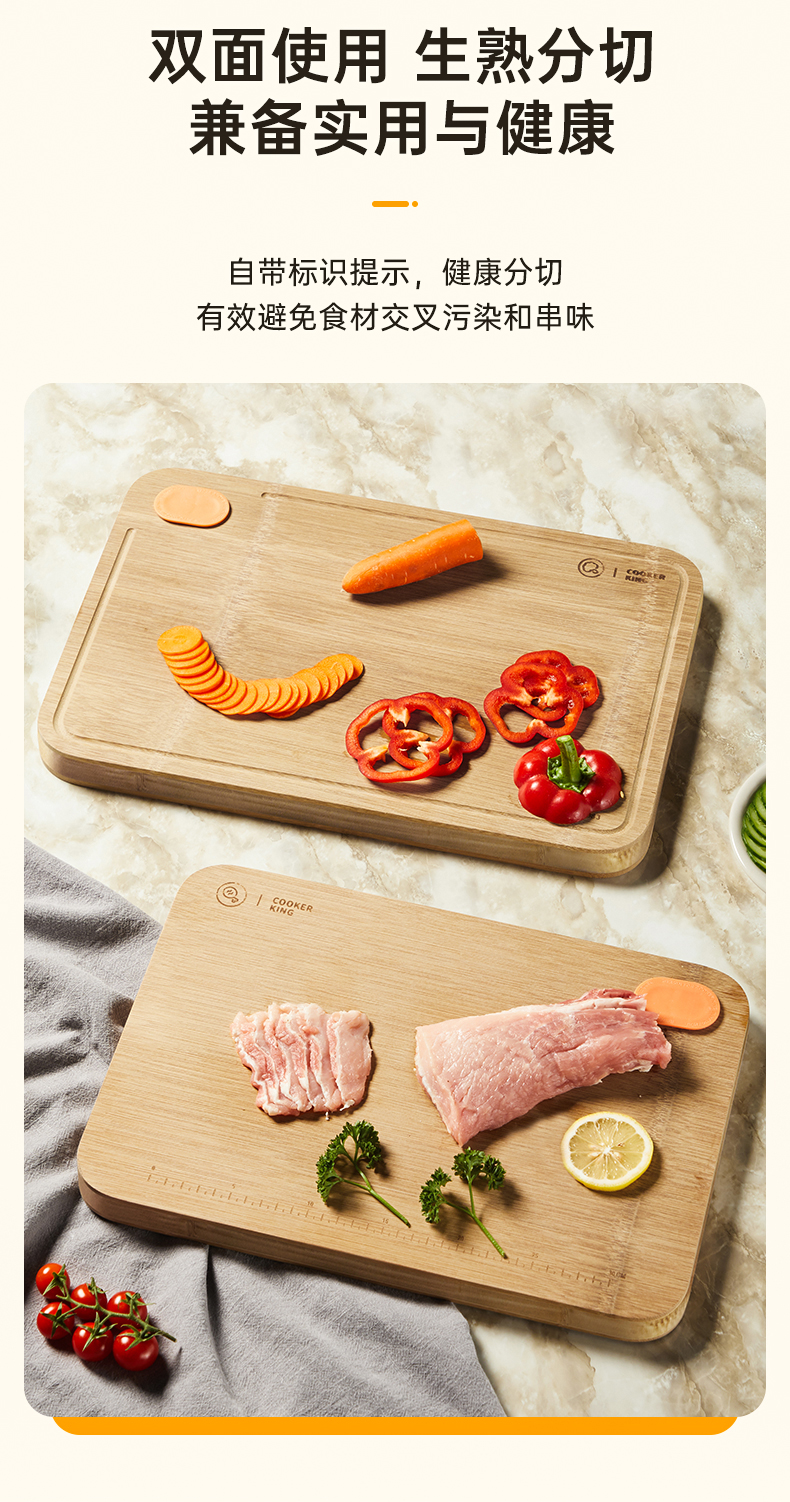 1、高山楠竹精制,无漆无蜡,健康放心用,天然楠竹整张展开制作无拼接,每块菜板皆为匠心之作。