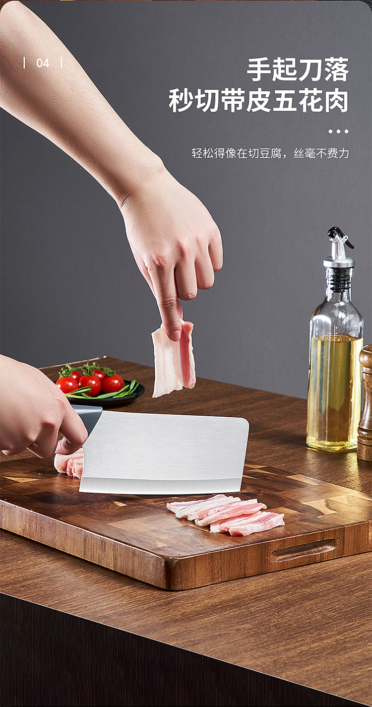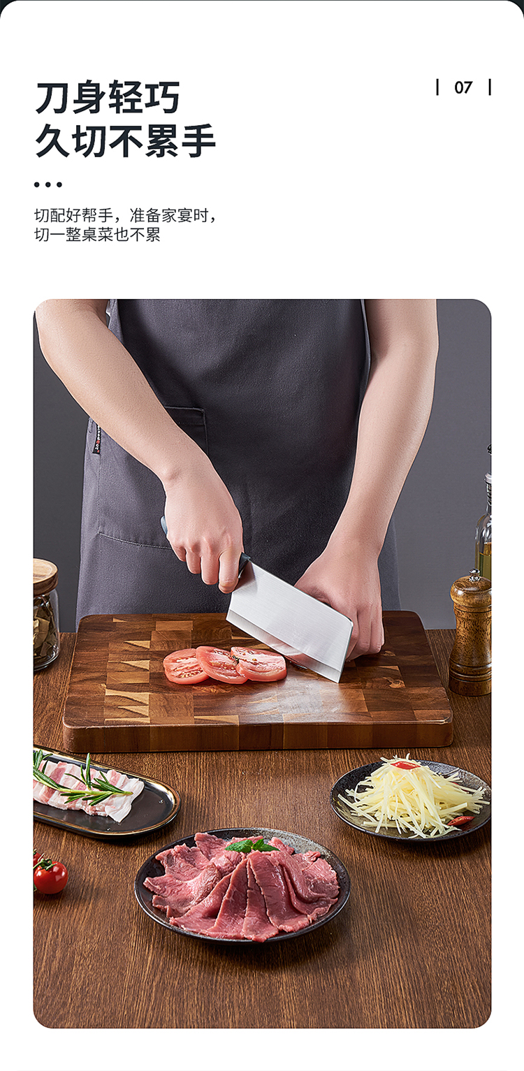 1、口薄背厚加倍锋利切配更省力,抛光刀面多次抛光平滑如镜,一冲即净不粘污渍清洗方便