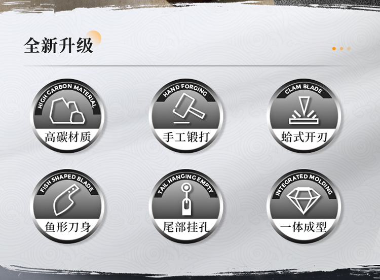 1、古法手工锻打、质地均匀耐磨损、刀刀利落不粘连、历久弥新 坚韧锋利,利刃快刀、切配快速不停顿,轻松掌握厨房切配技巧。