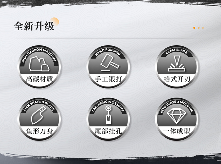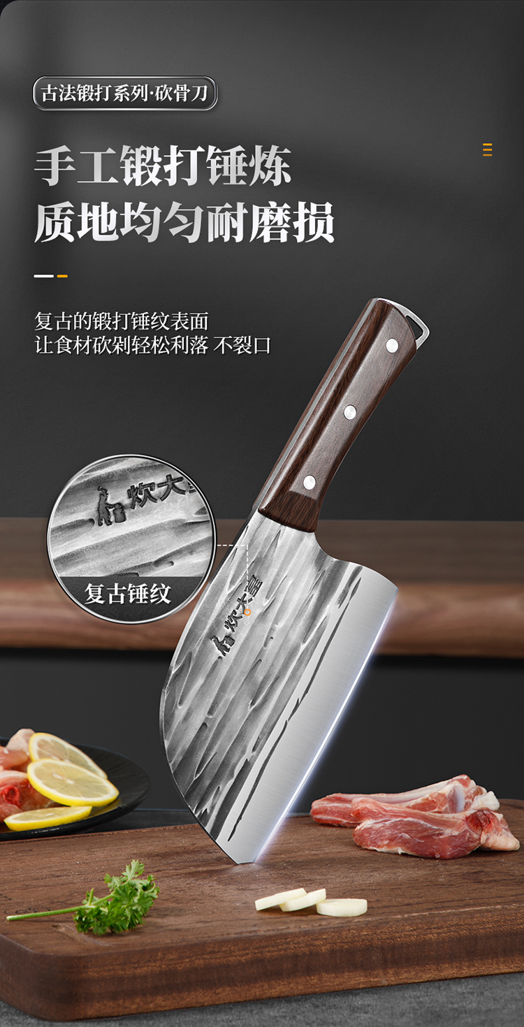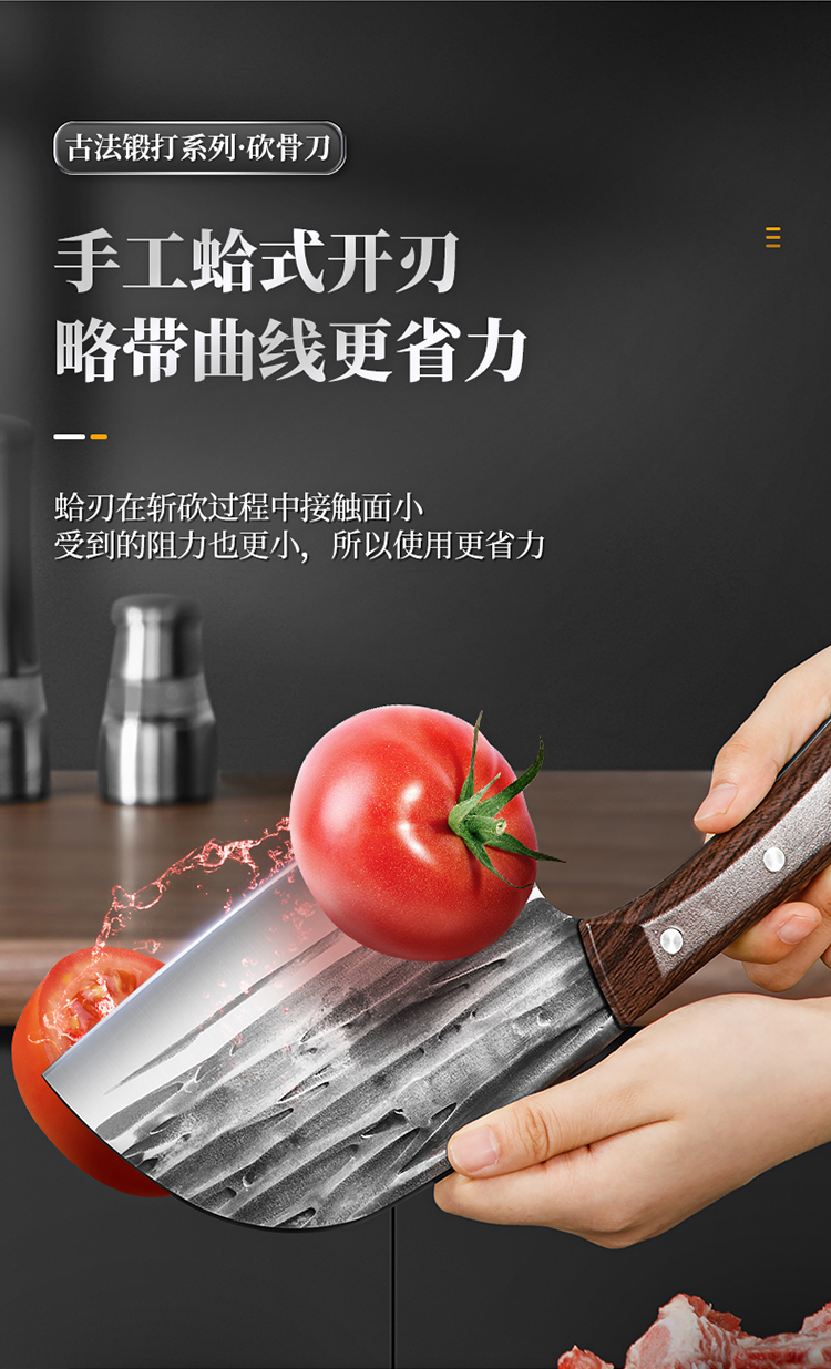 1、古法手工锻打、质地均匀耐磨损、刀刀利落不粘连、历久弥新 坚韧锋利,利刃快刀、切配快速不停顿,轻松掌握厨房切配技巧。