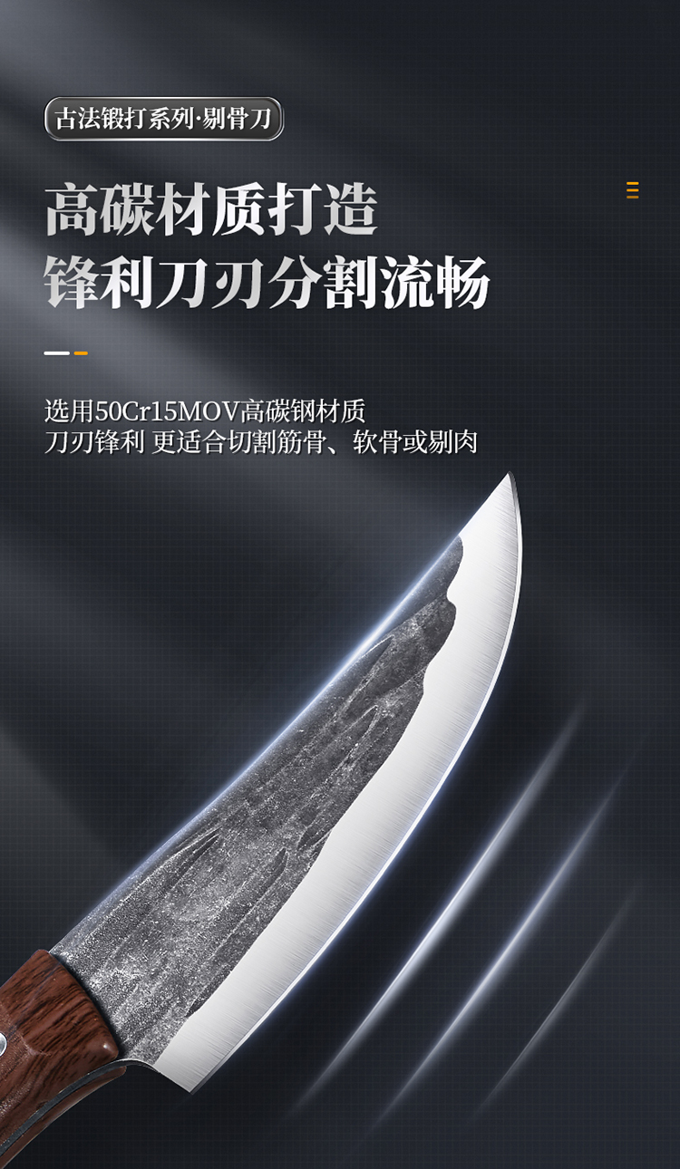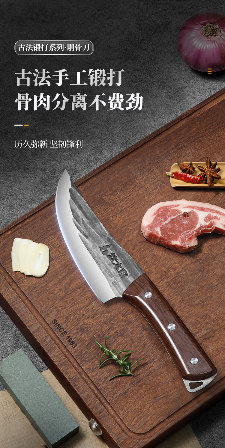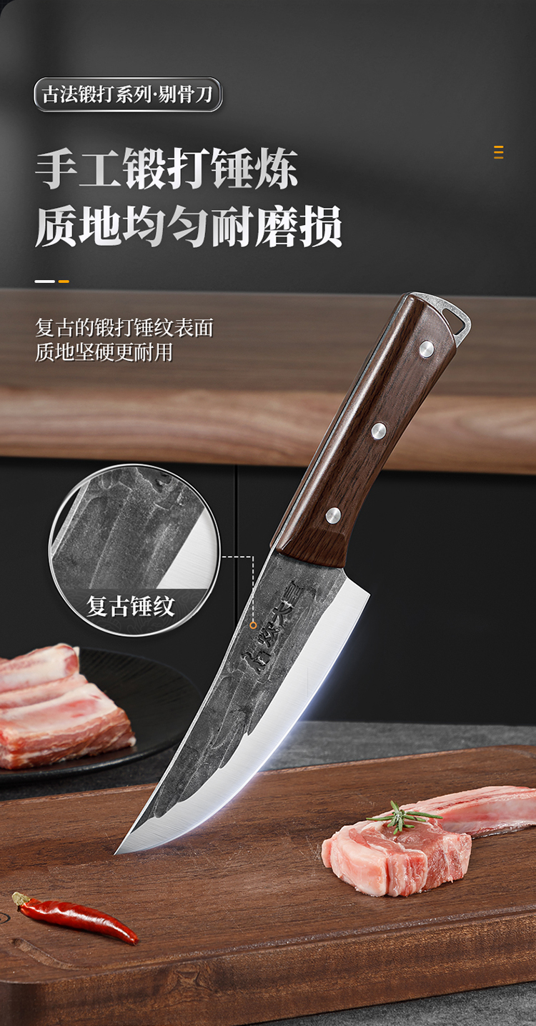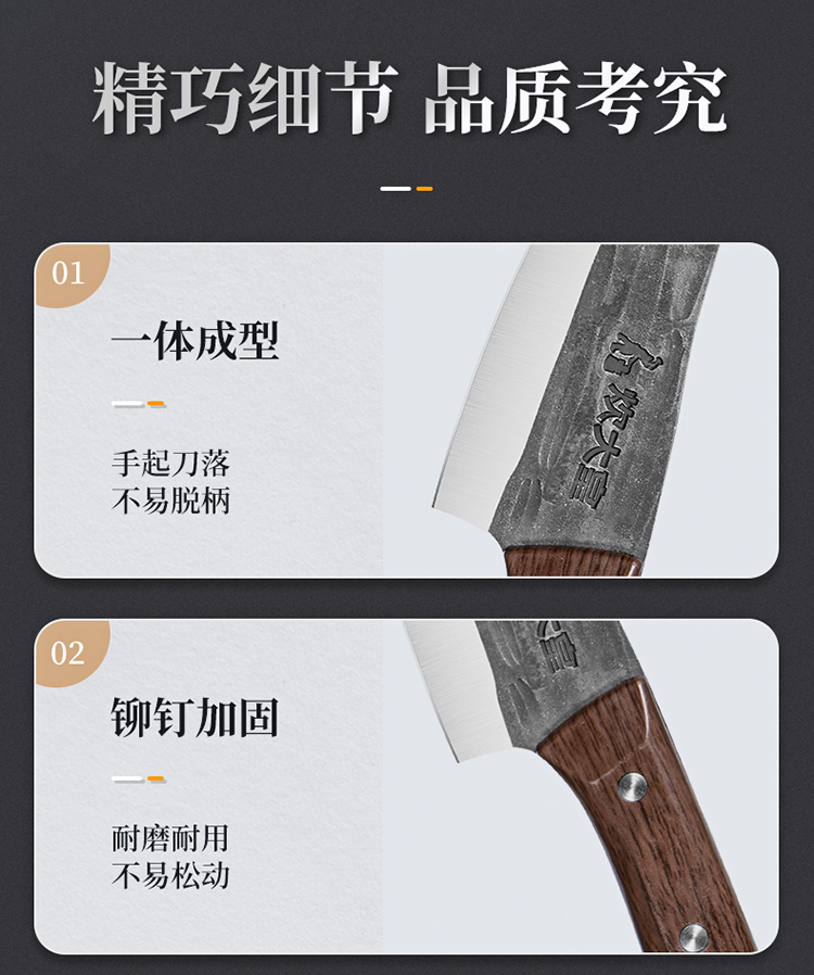 1、古法手工锻打、质地均匀耐磨损、刀刀利落不粘连、历久弥新 坚韧锋利,利刃快刀、切配快速不停顿,轻松掌握厨房切配技巧。