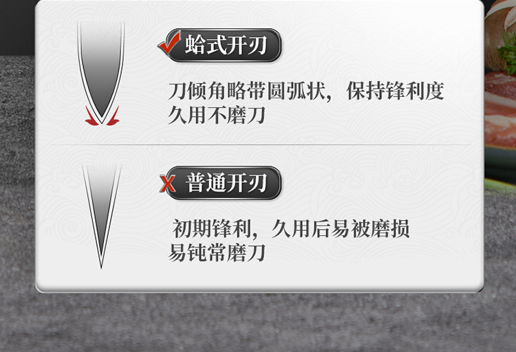 2、蛤刃在削切和斩砍过程中接触面小,受到的阻力也更小,所以使用更省力。