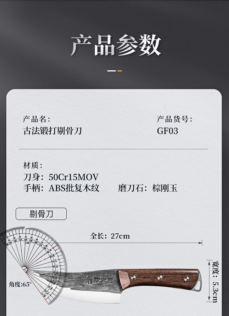 材质:刀身:50Cr15MOV手柄:ABS批复木纹