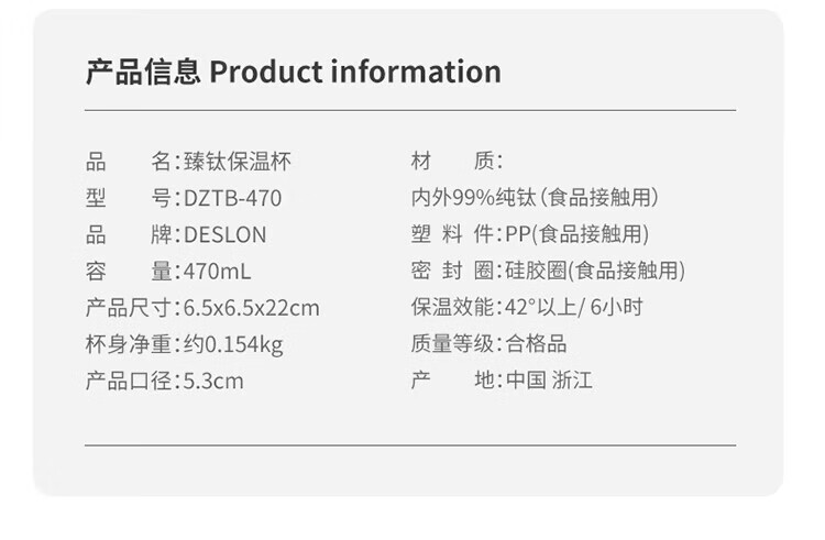杯体材质:内外99%纯钛(食品接触用)