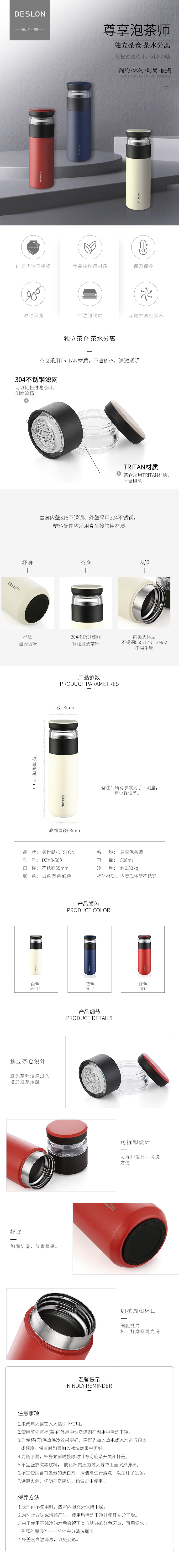 德世朗(DESLON) 尊享泡茶杯 保温杯 500mL 白色 蓝色 DZXB-500