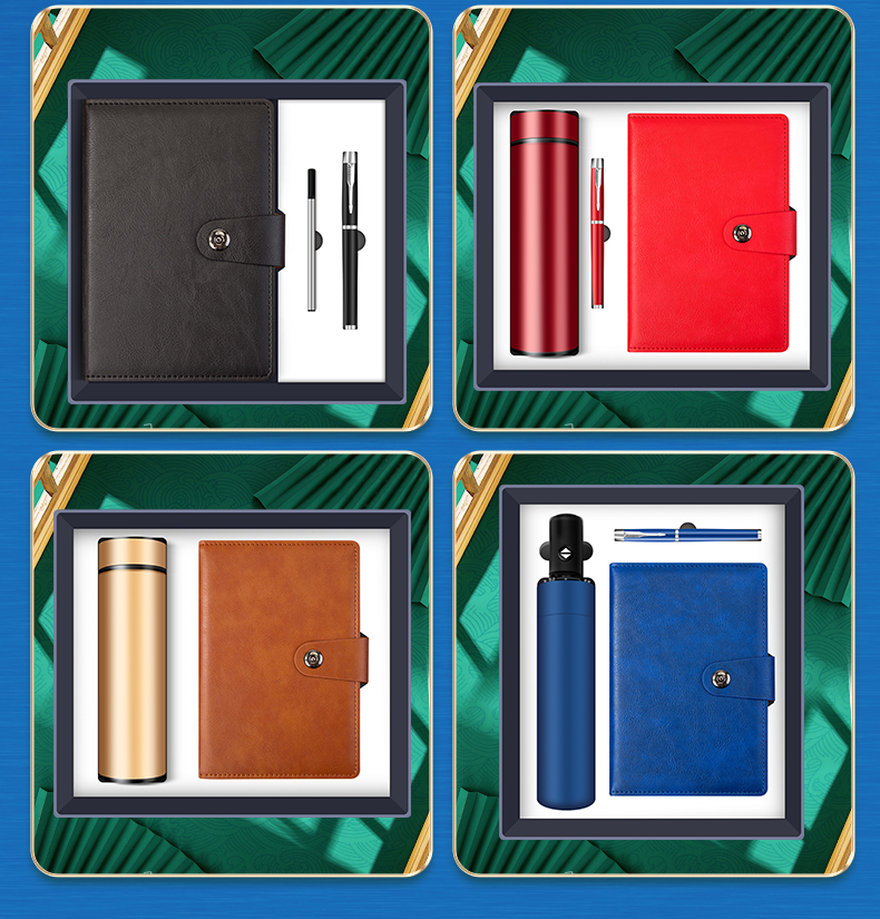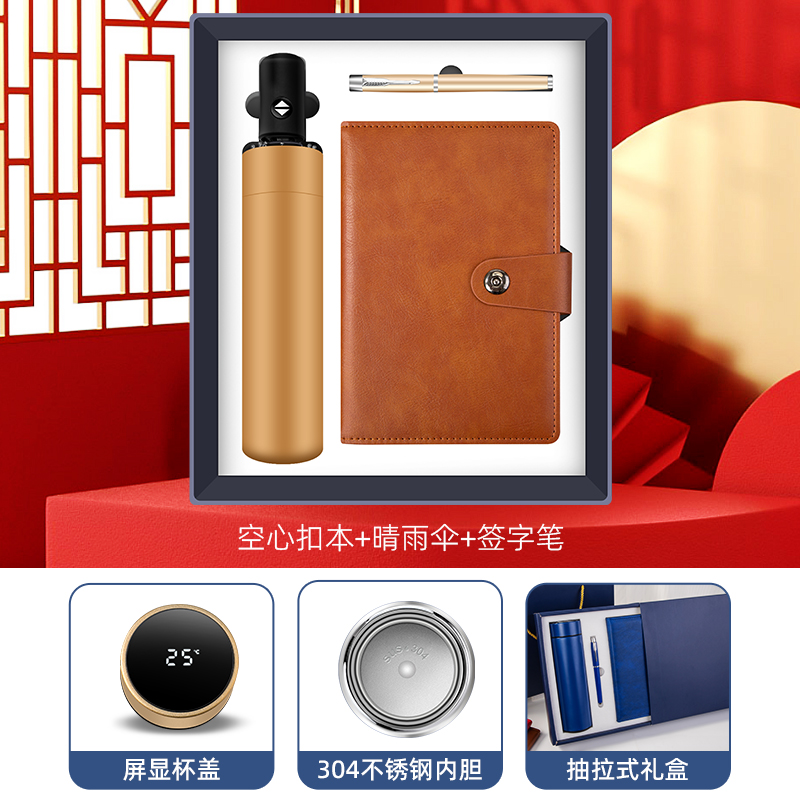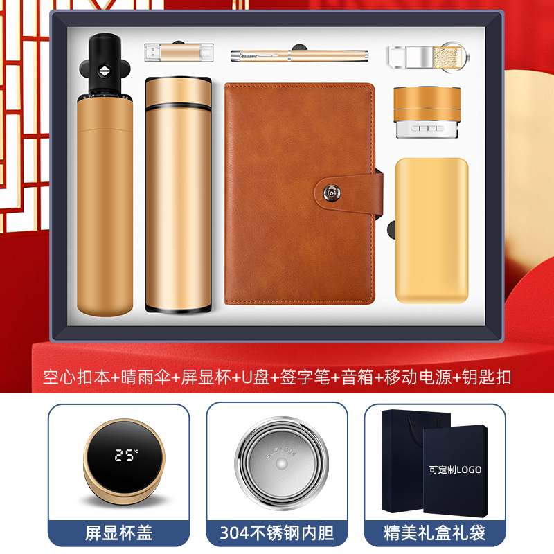 A5空心扣本自动八骨伞圆笔450ML数显杯音响32G手机U盘钥匙扣四线电源八件套金色配6号蓝盒TGC1057