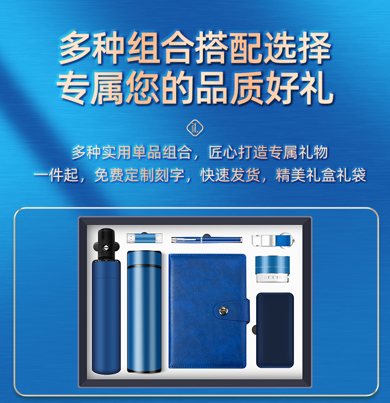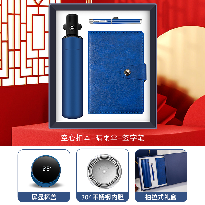 A5空心扣本自动八骨伞圆笔450ML数显杯音响32G手机U盘钥匙扣四线电源八件套蓝色配6号蓝盒TGC1027