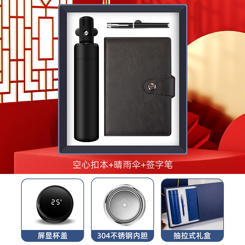 A5空心扣本自动八骨伞圆笔450ML数显杯音响32G手机U盘钥匙扣四线电源八件套黑色配6号蓝盒TGC1017
