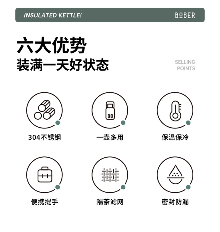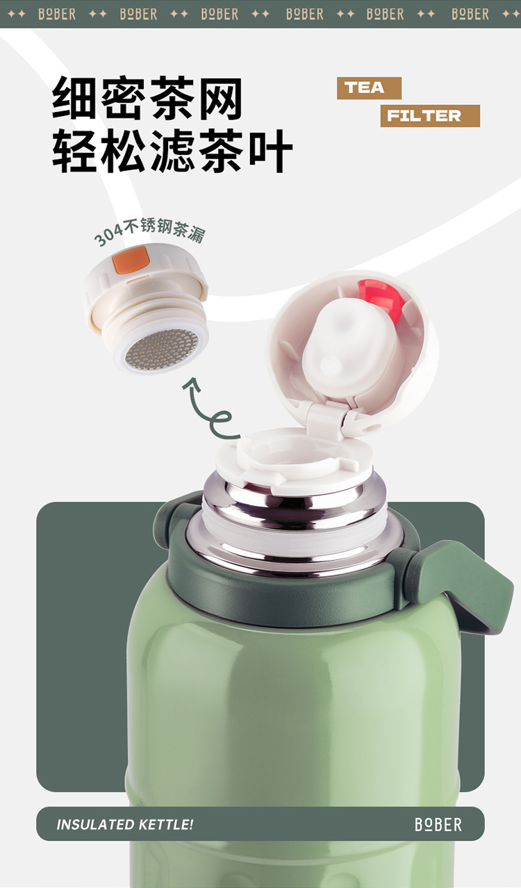 杯体材质:内304 密封圈:硅胶(食品接触用) 塑料件:PP(食品接触用)滤网材质:304不锈钢