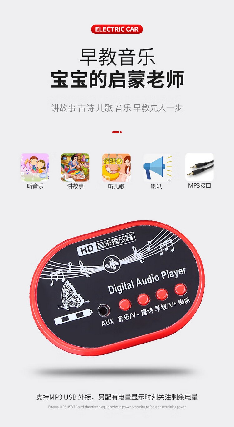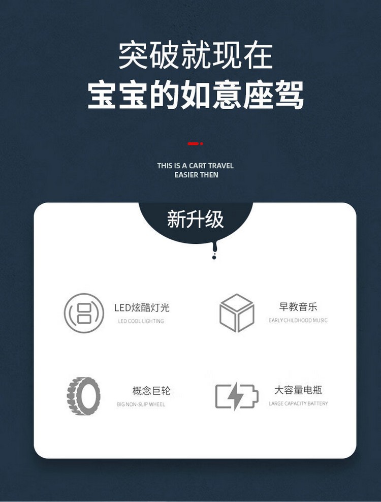 防滑车轮,音乐灯光,加大车身,升级加大电瓶,续航更持久,灵活车把,强劲电机,强勃驱动动力低噪音、强劲、稳定,使用寿命长,环保材质,安全承重,平稳防侧翻,无遥控