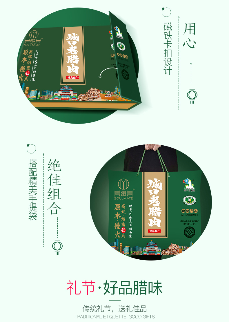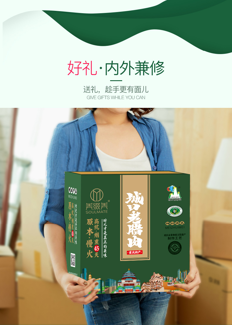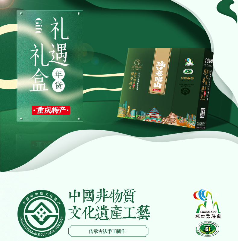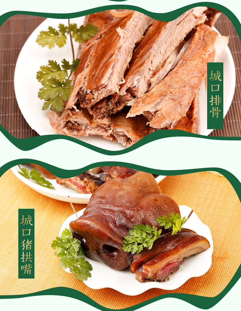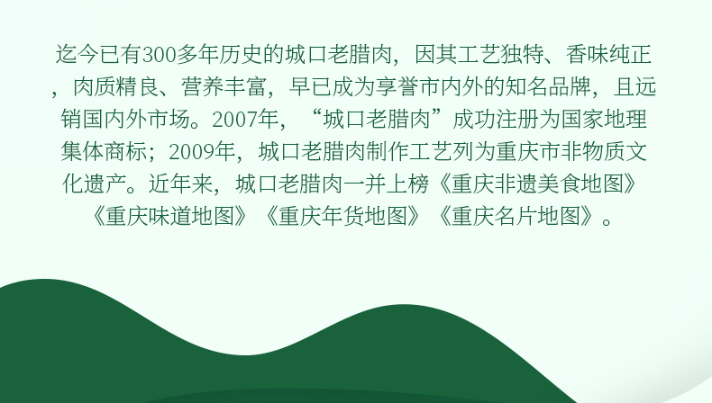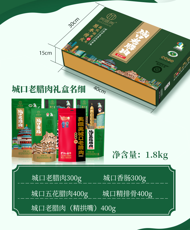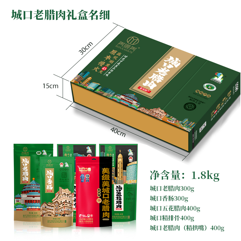 内配:城口老腊肉300g、城口香肠300g、城口五花腊肉400g、城口精排骨400g、城口老腊肉(精拱嘴)400g
