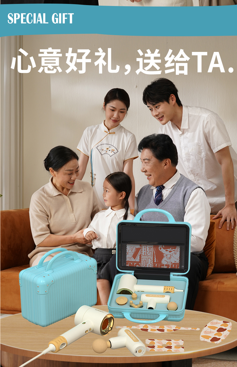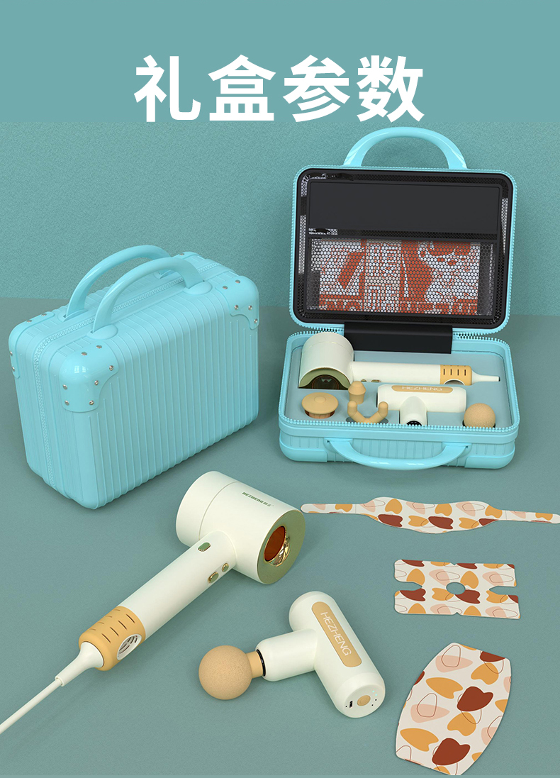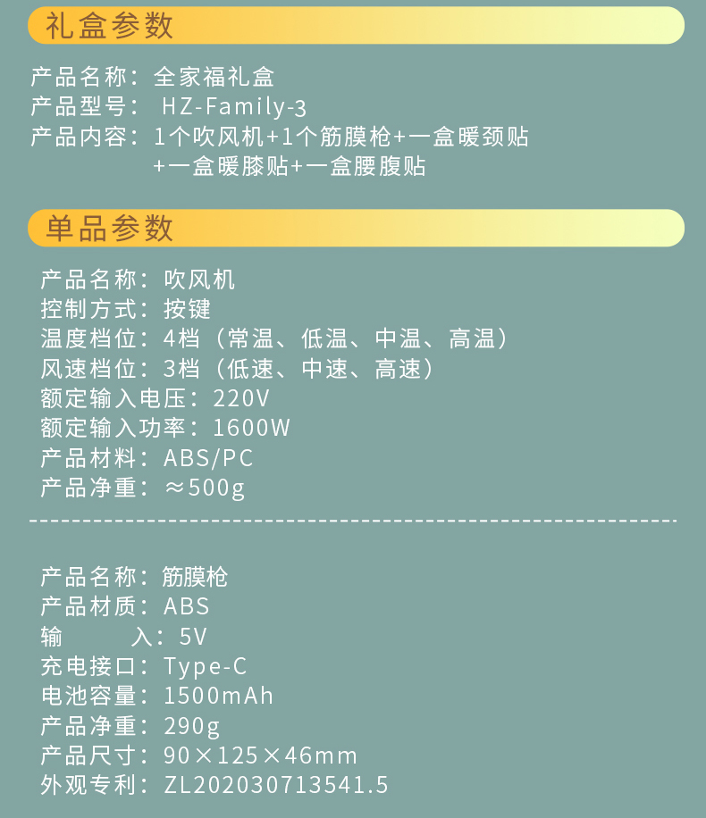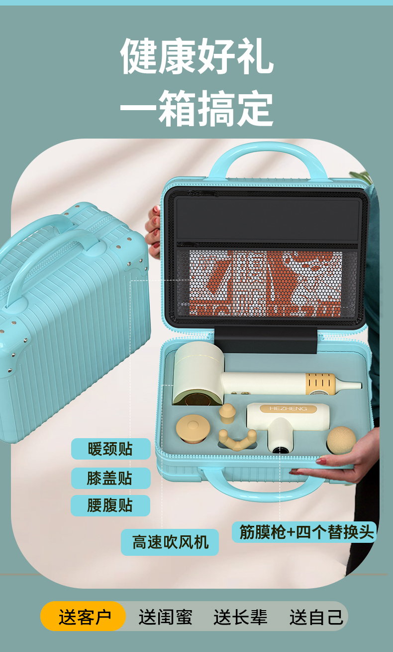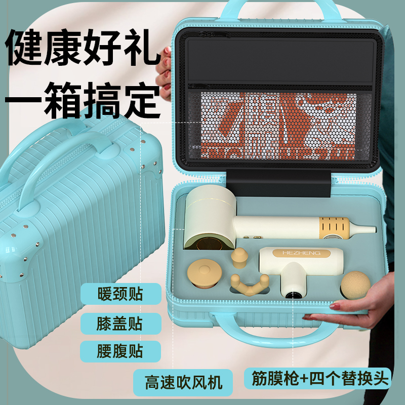 1个吹风机+1个筋膜枪+一盒暖颈贴+一盒暖膝贴+一盒腰腹贴