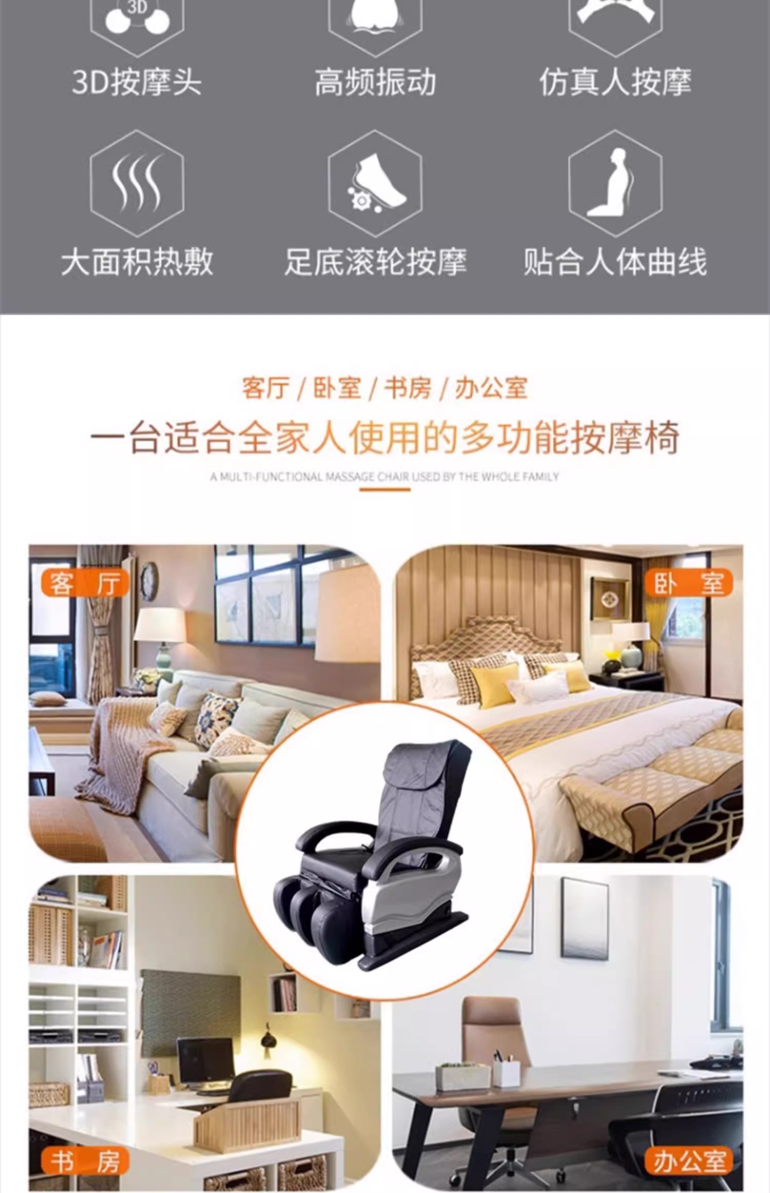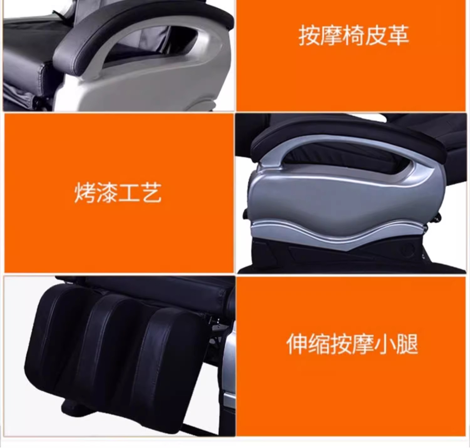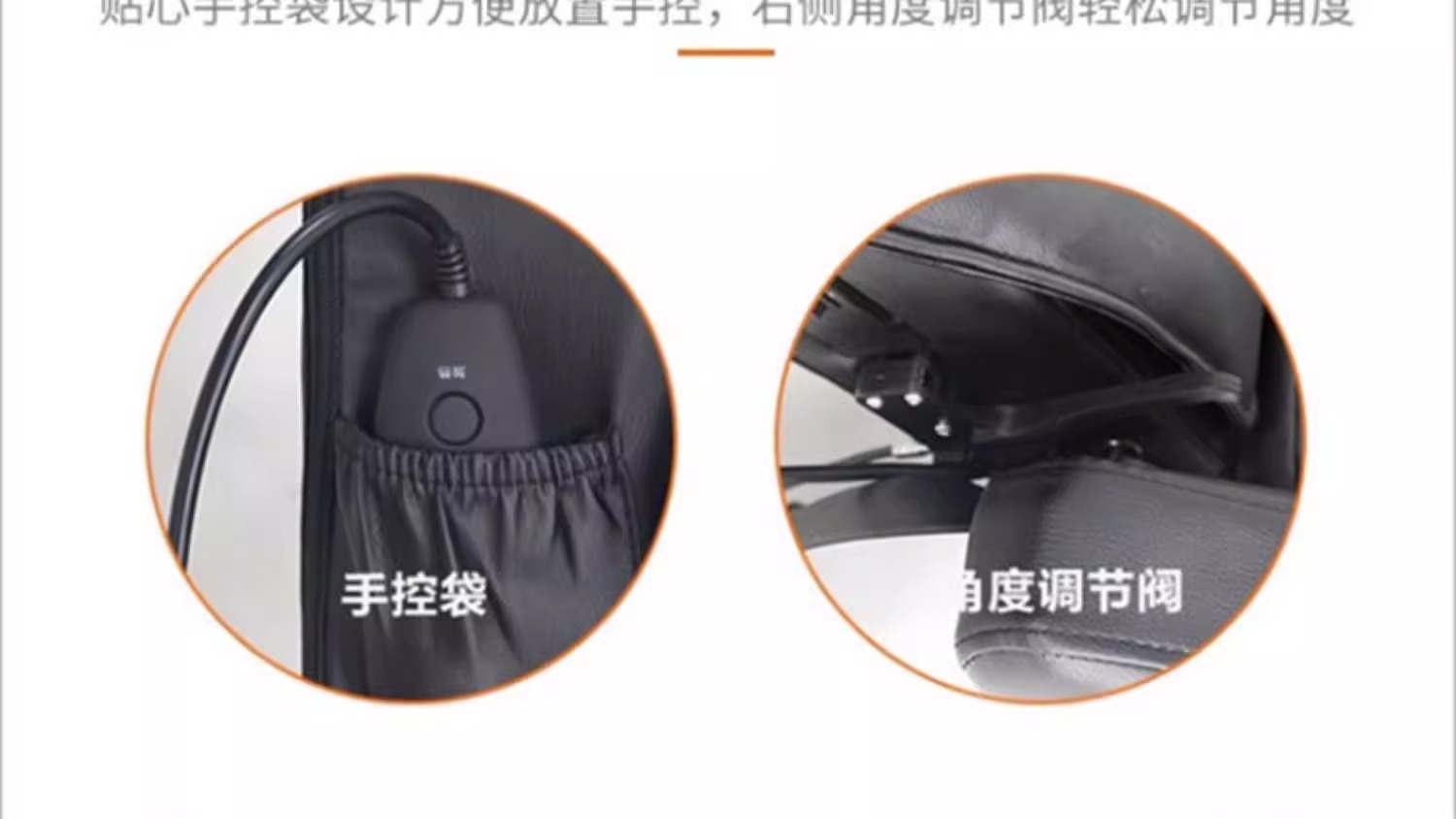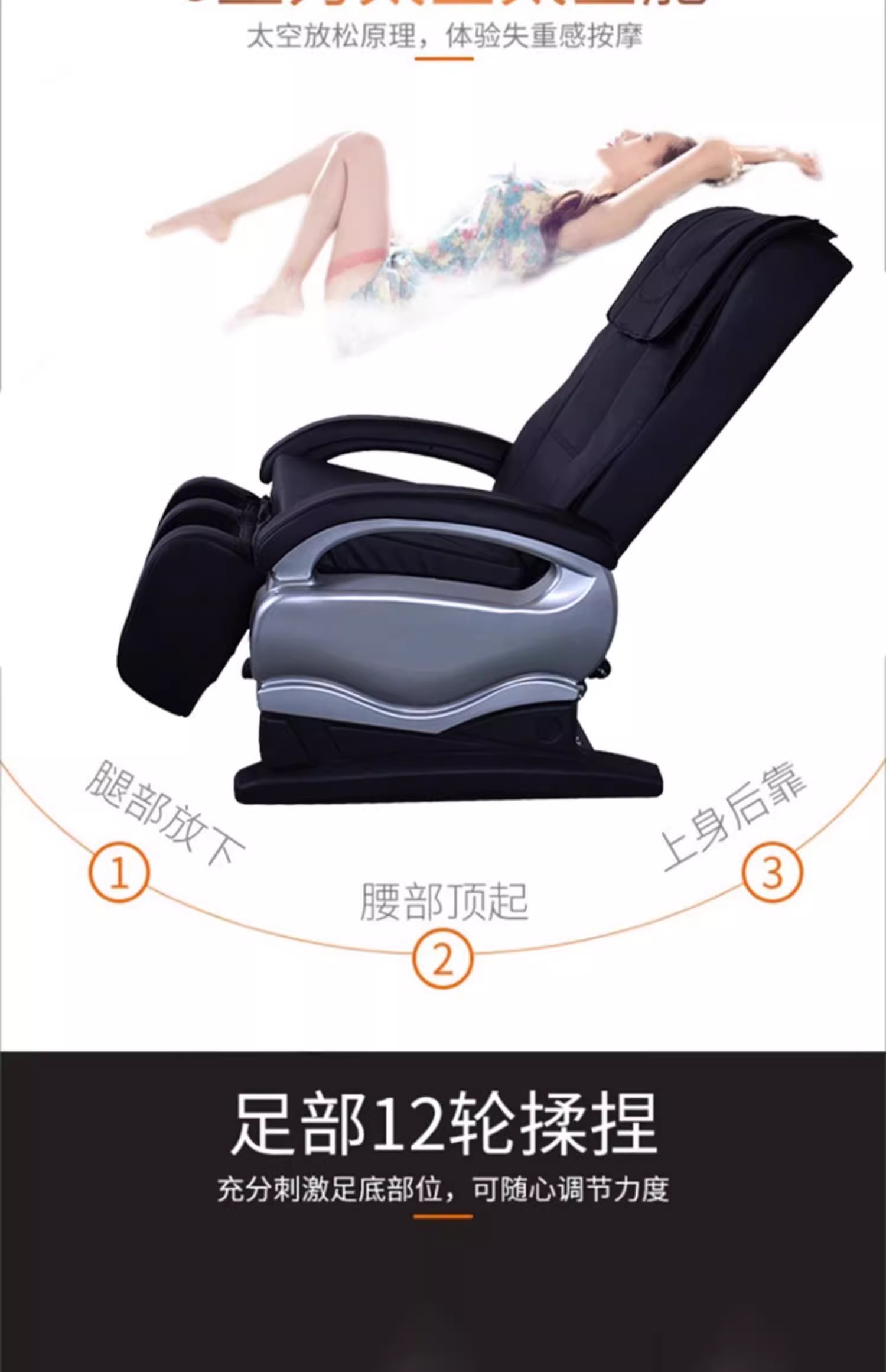 靠背设有四组按摩球,颈部两个,背部六个,上腰六个,下腰六个。20个按摩球都带有光波加热功能,按摩速度可调,按摩方式正反转可调。坐垫设有一个振动电机,两边腿部各设有一个振动电机。液压设计任意手动调节零重力和靠背的角度,最低躺平170度。遥控无极调速,滑轮设计移动轻松快捷!(可定制升级版带头部震动按摩)