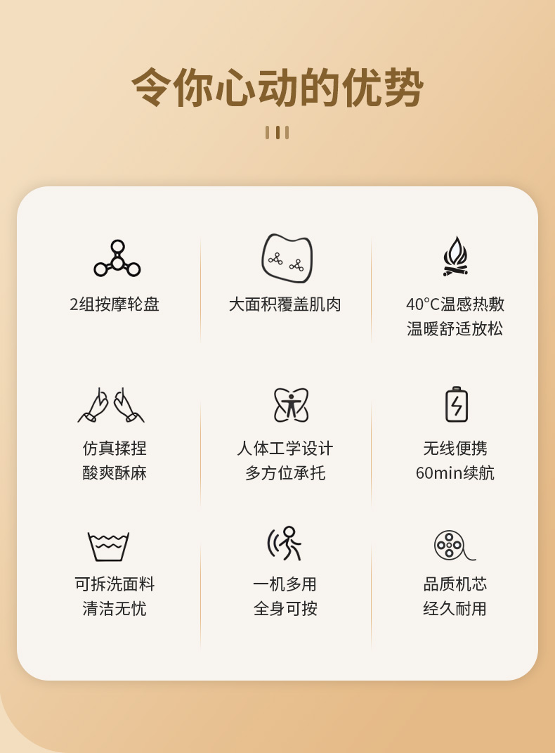 3,2组按摩轮盘,大面积覆盖肌肉,40度温感热敷,仿真揉捏,一机多用; 4,可拆洗外套,清洁又卫生,经久耐用;