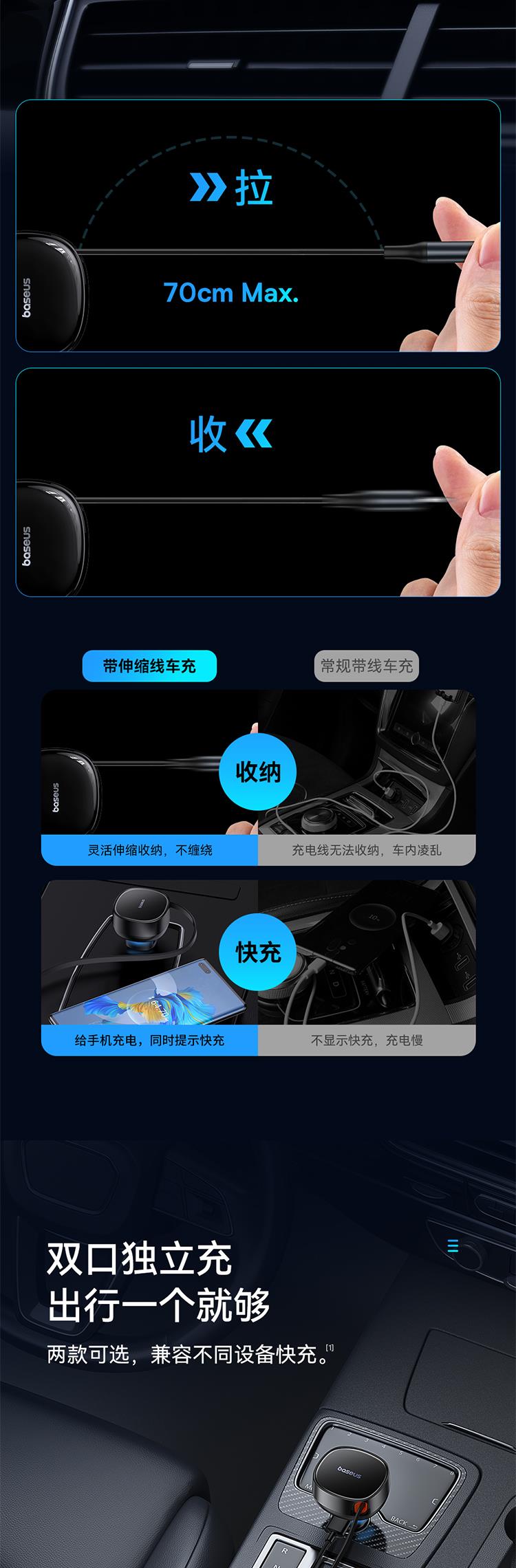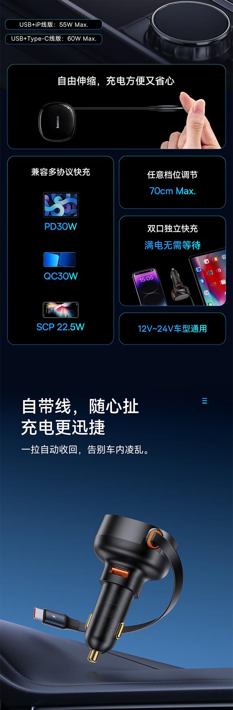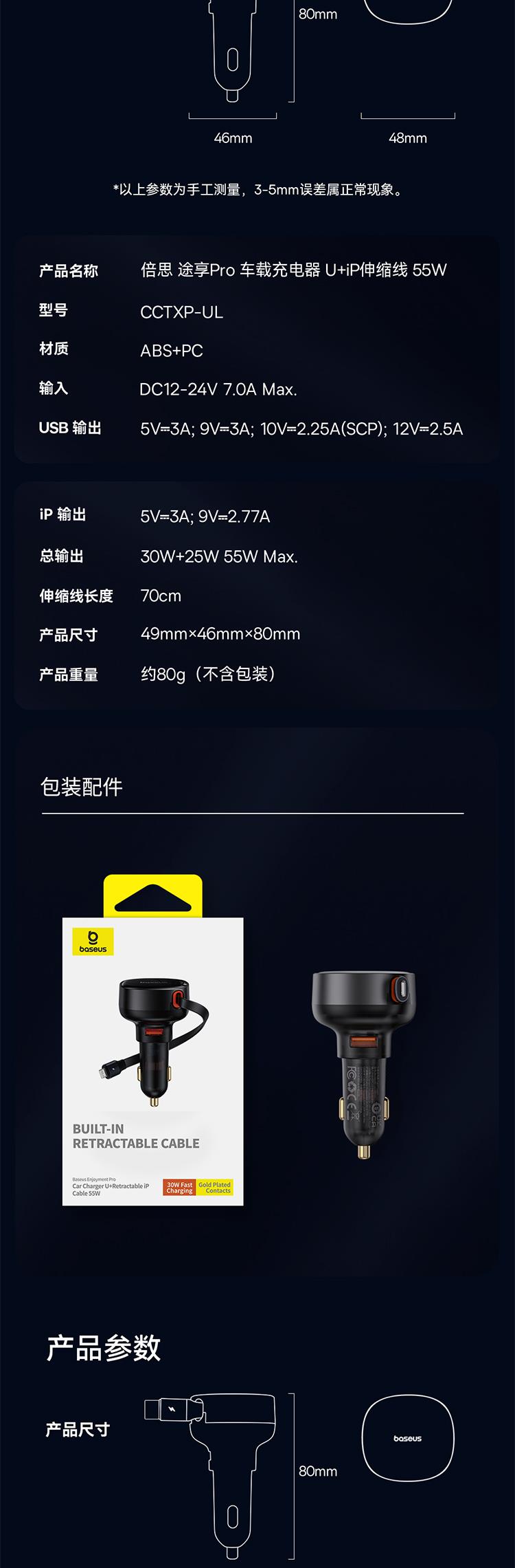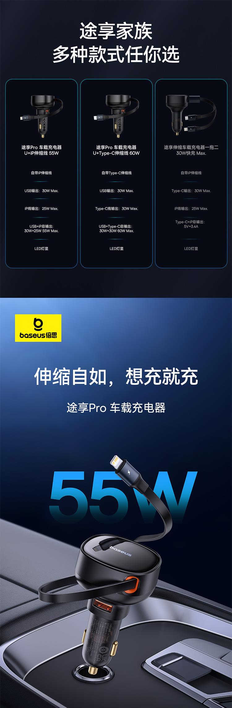 倍思途享Pro车载充电器星曜黑规格:U+iP伸缩线55W C00057801111-00