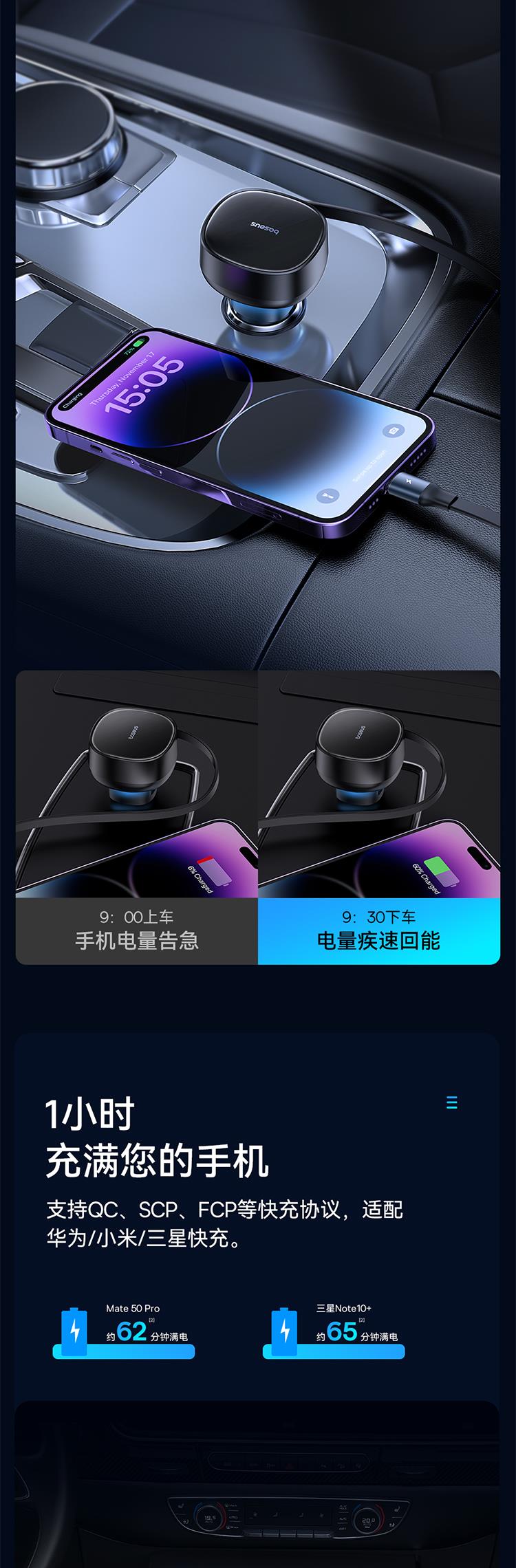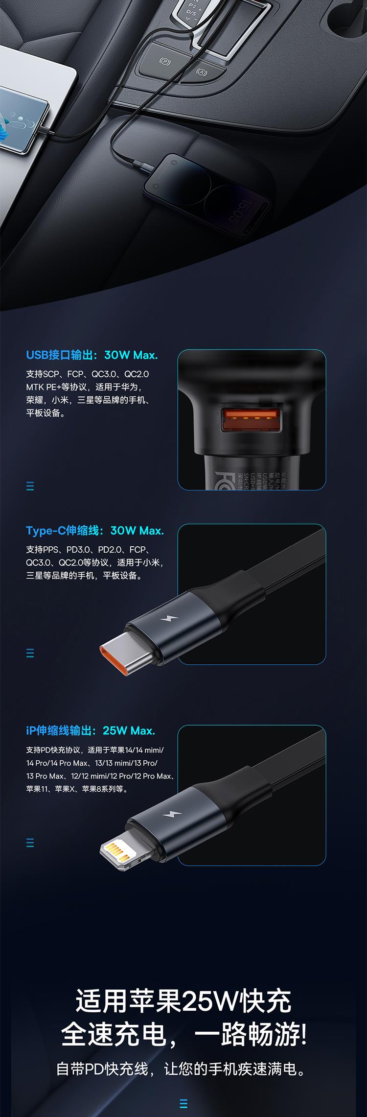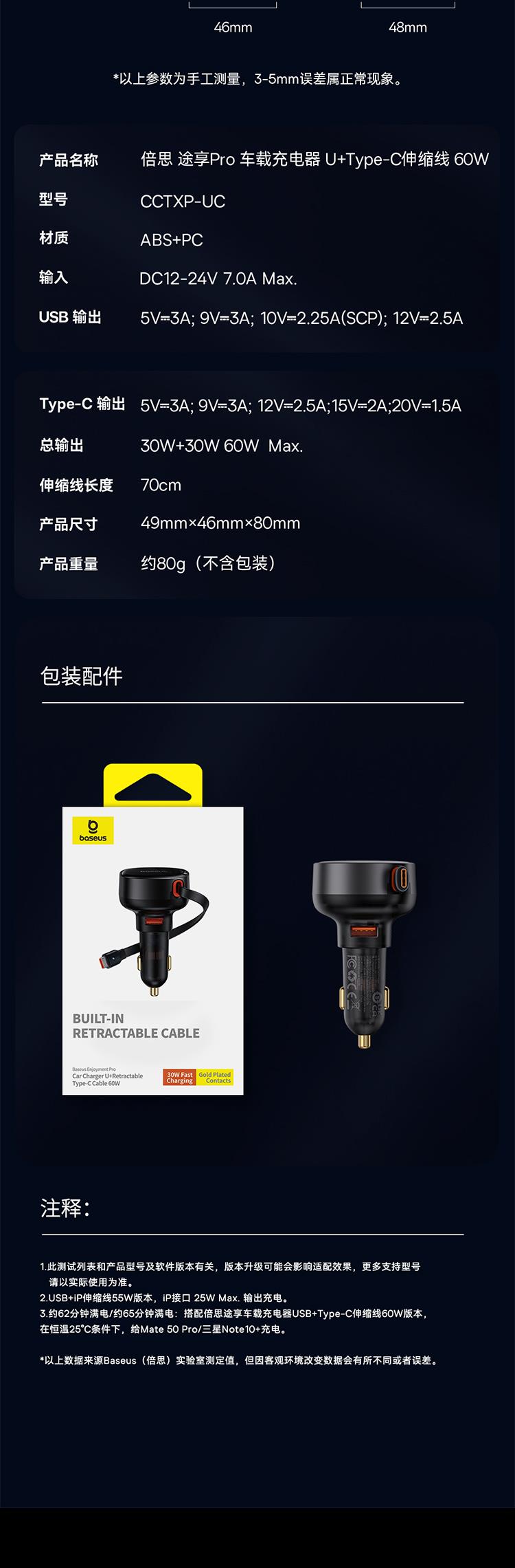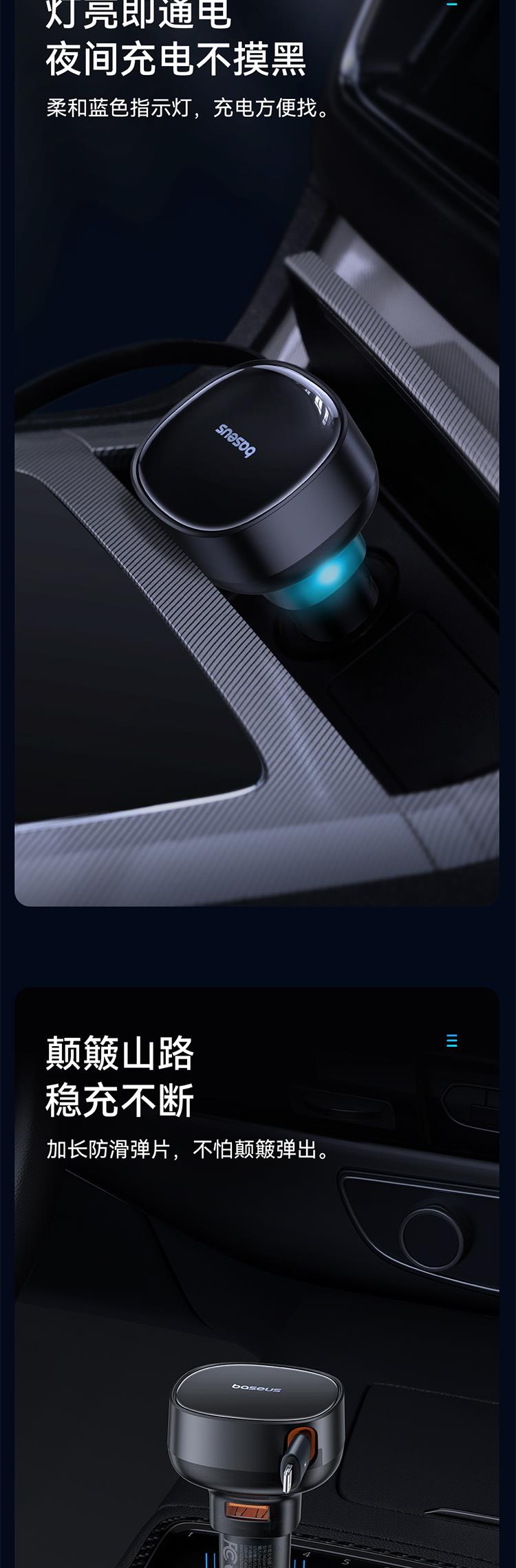 倍思途享Pro车载充电器星曜黑规格:U+iP伸缩线55W C00057801111-00