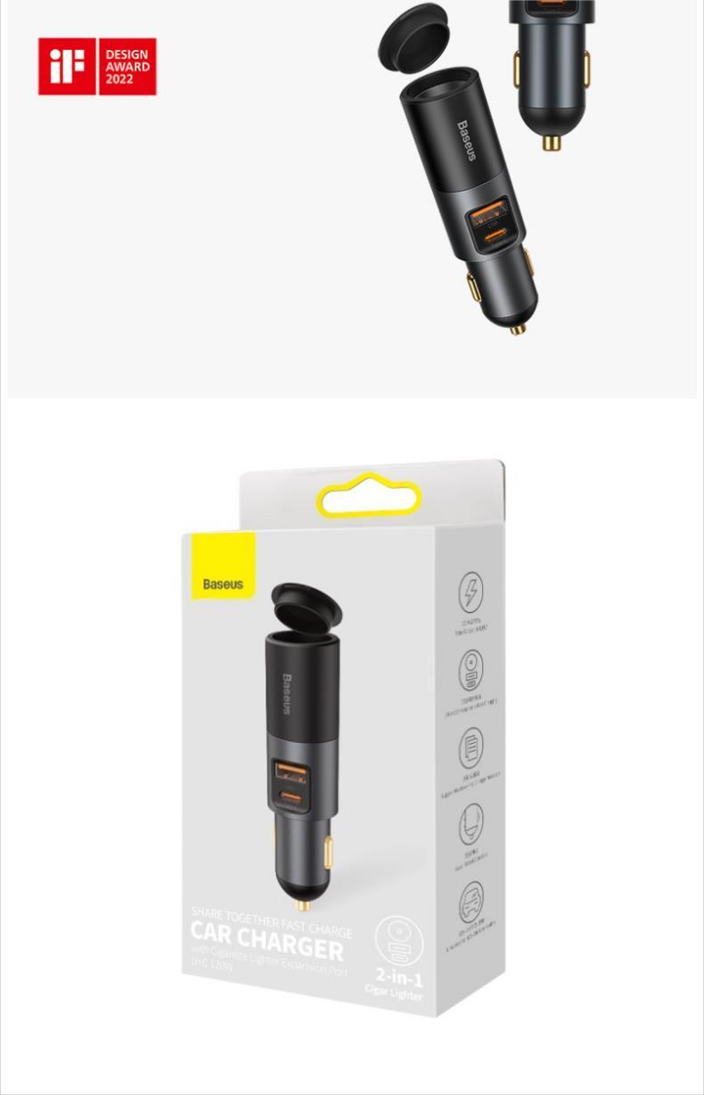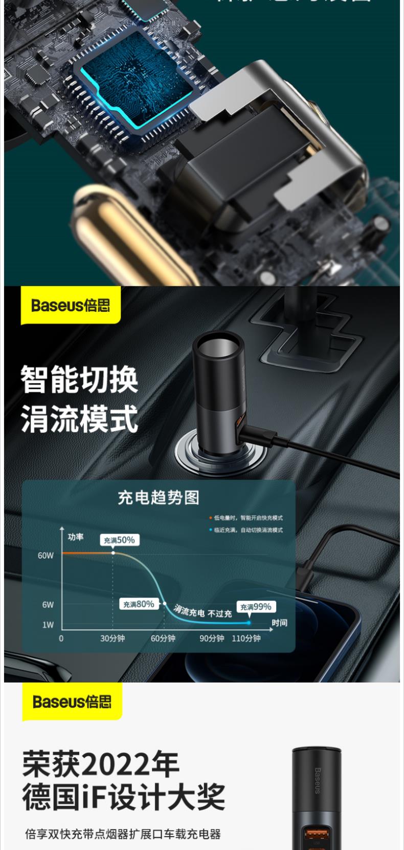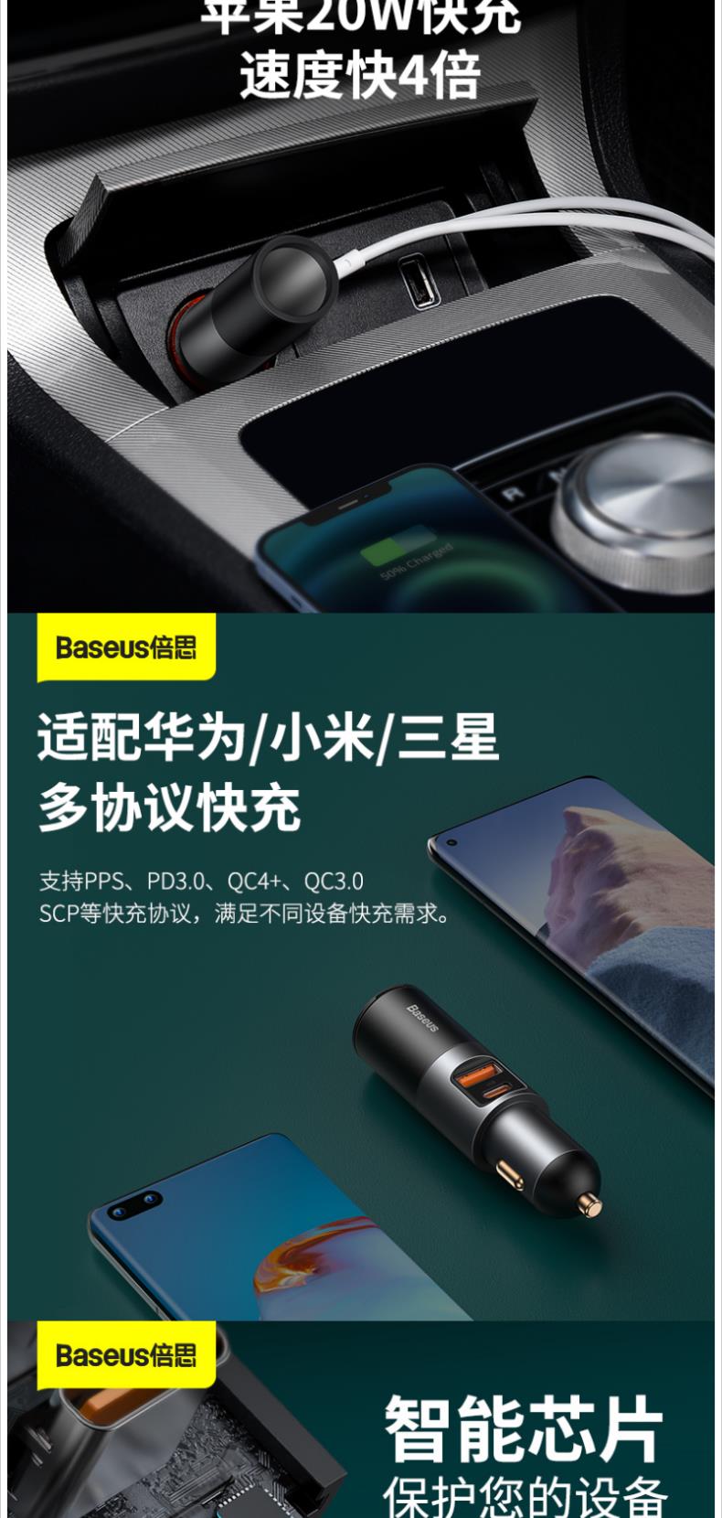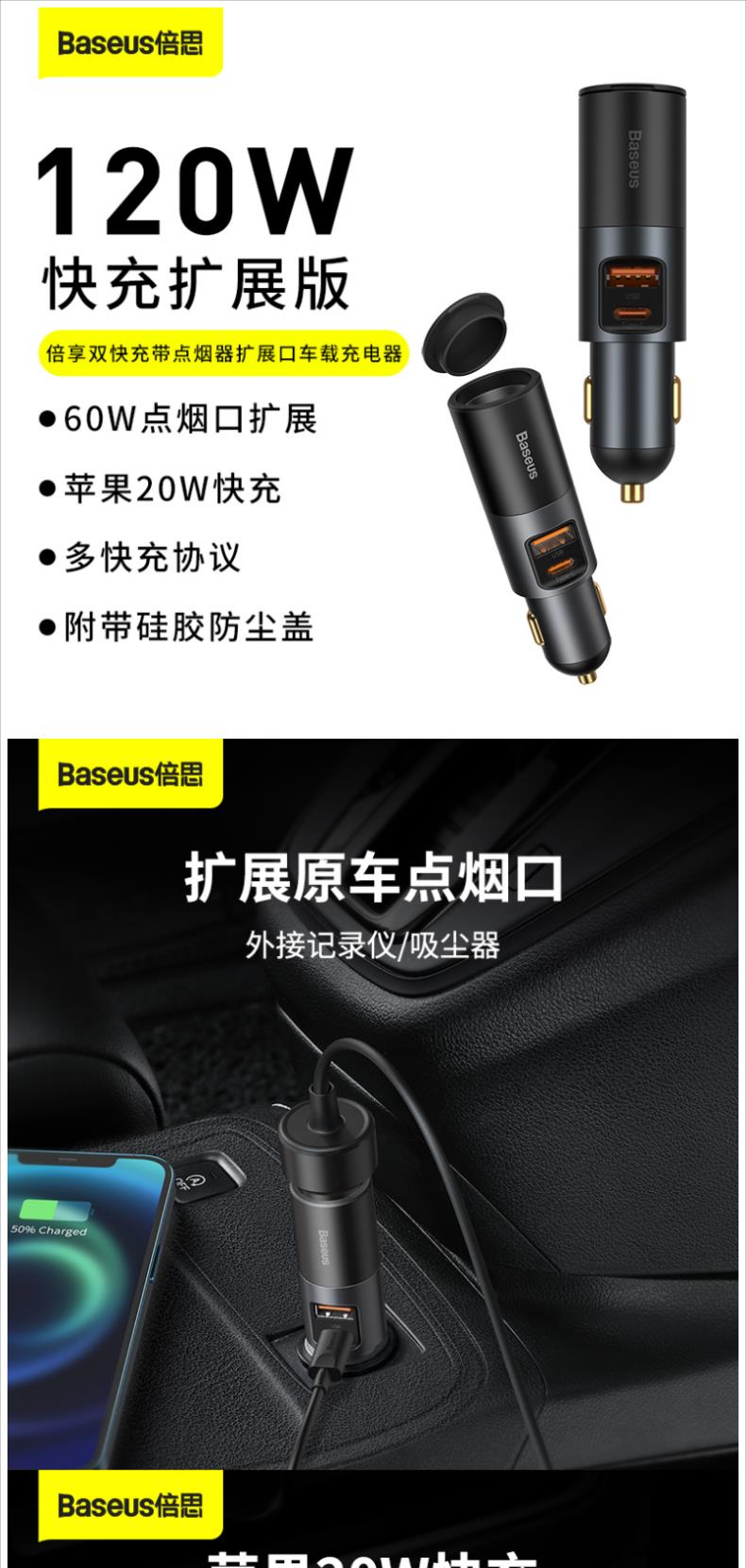 倍思倍享双快充带点烟器扩展口车载充电器规格:U+U120W太空灰
