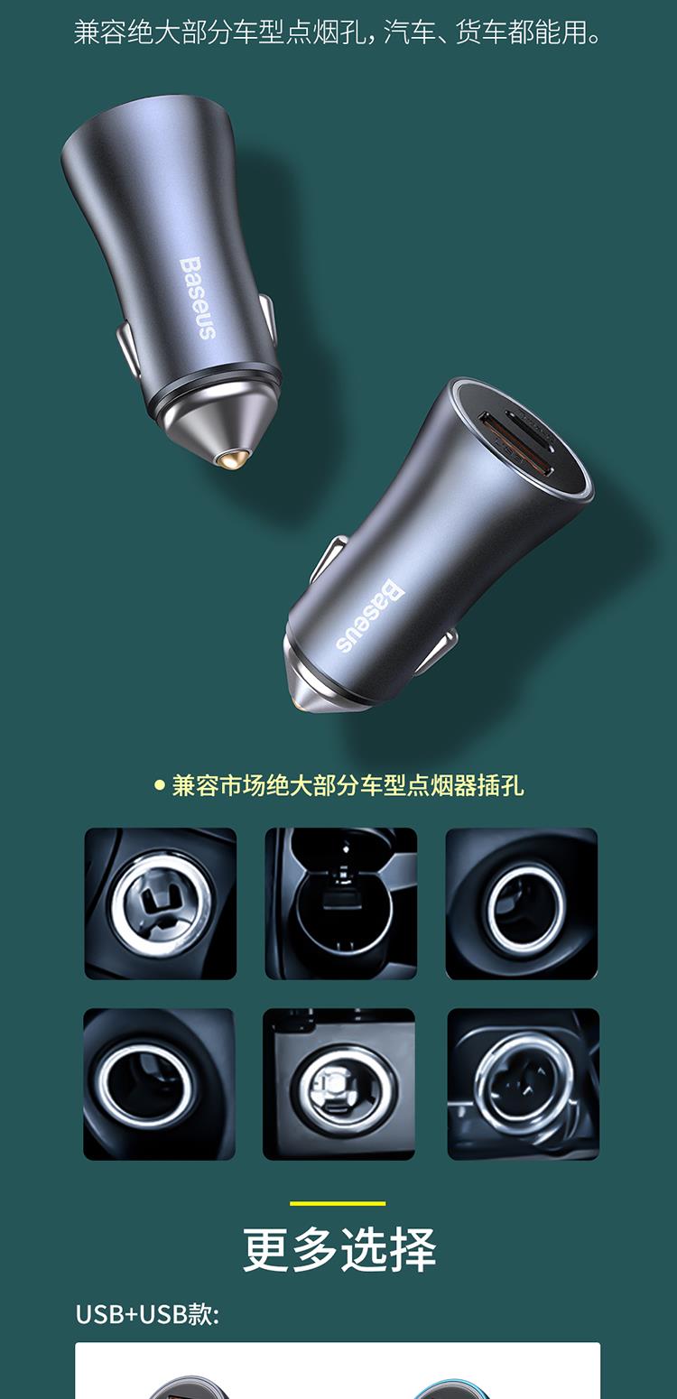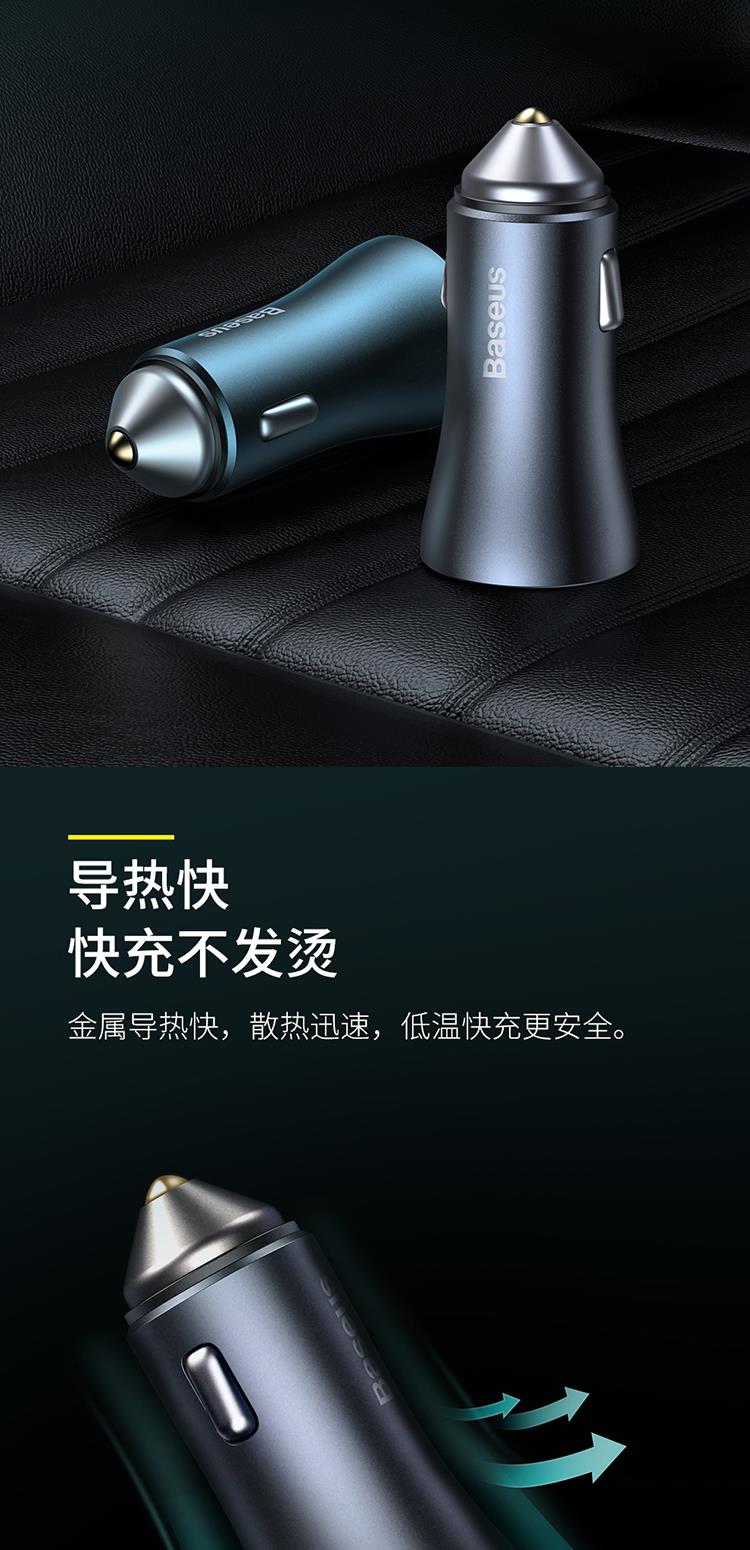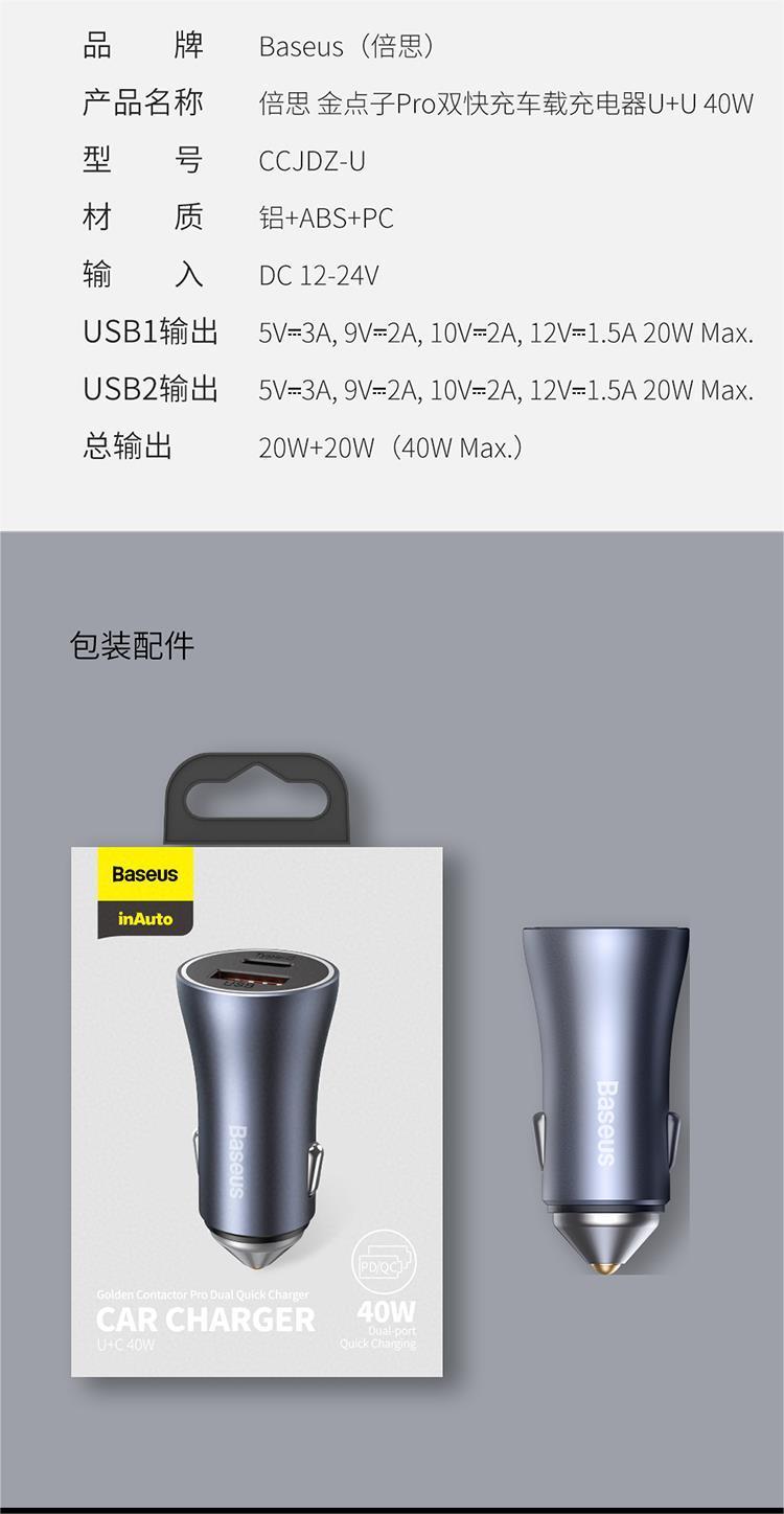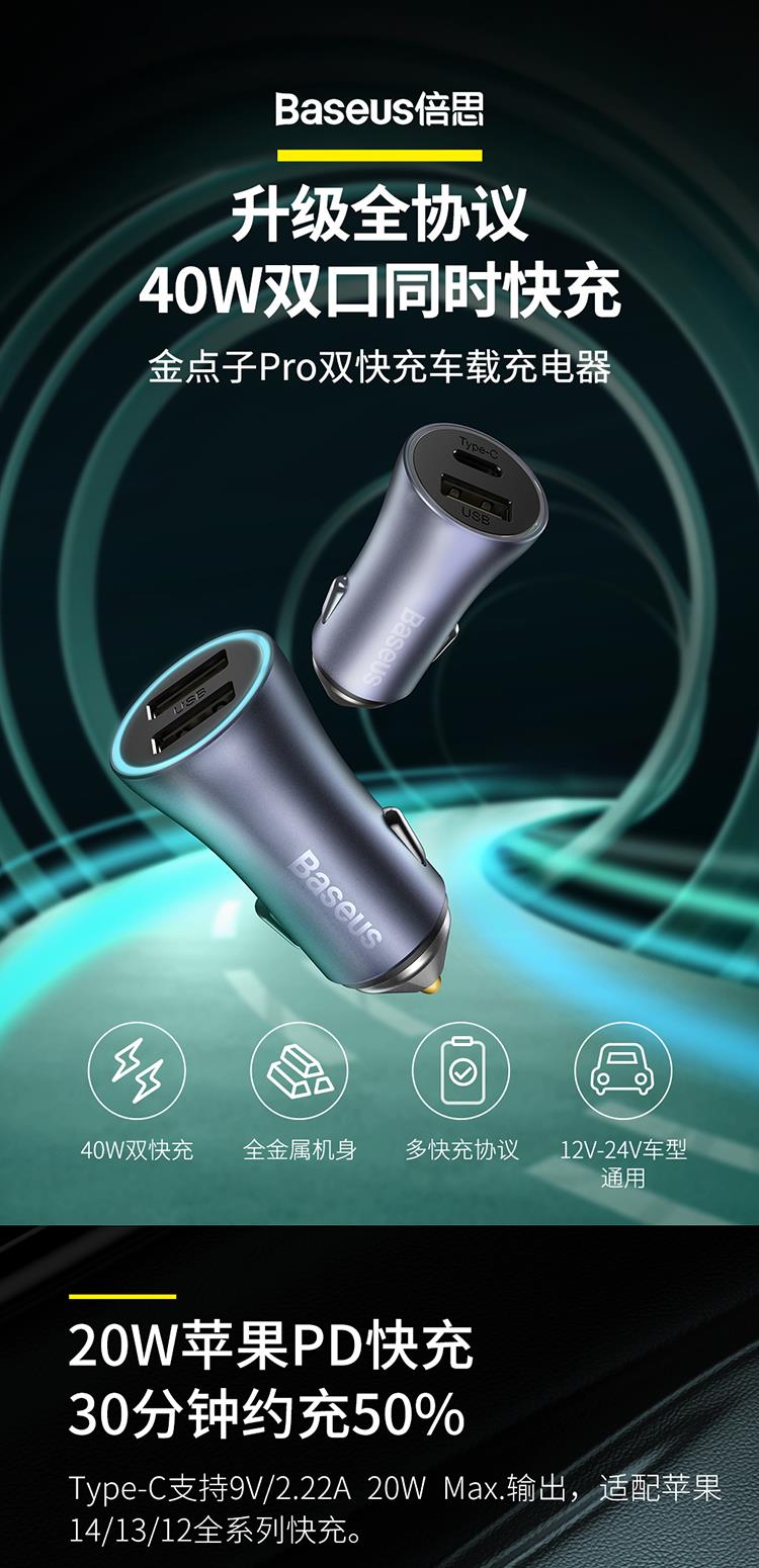 倍思金点子Pro双快充车载充电器40W规格:U+U套装深灰色(含:简易通用数据线USBFORTYPE-C5A1M黑色)