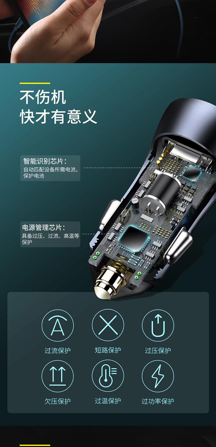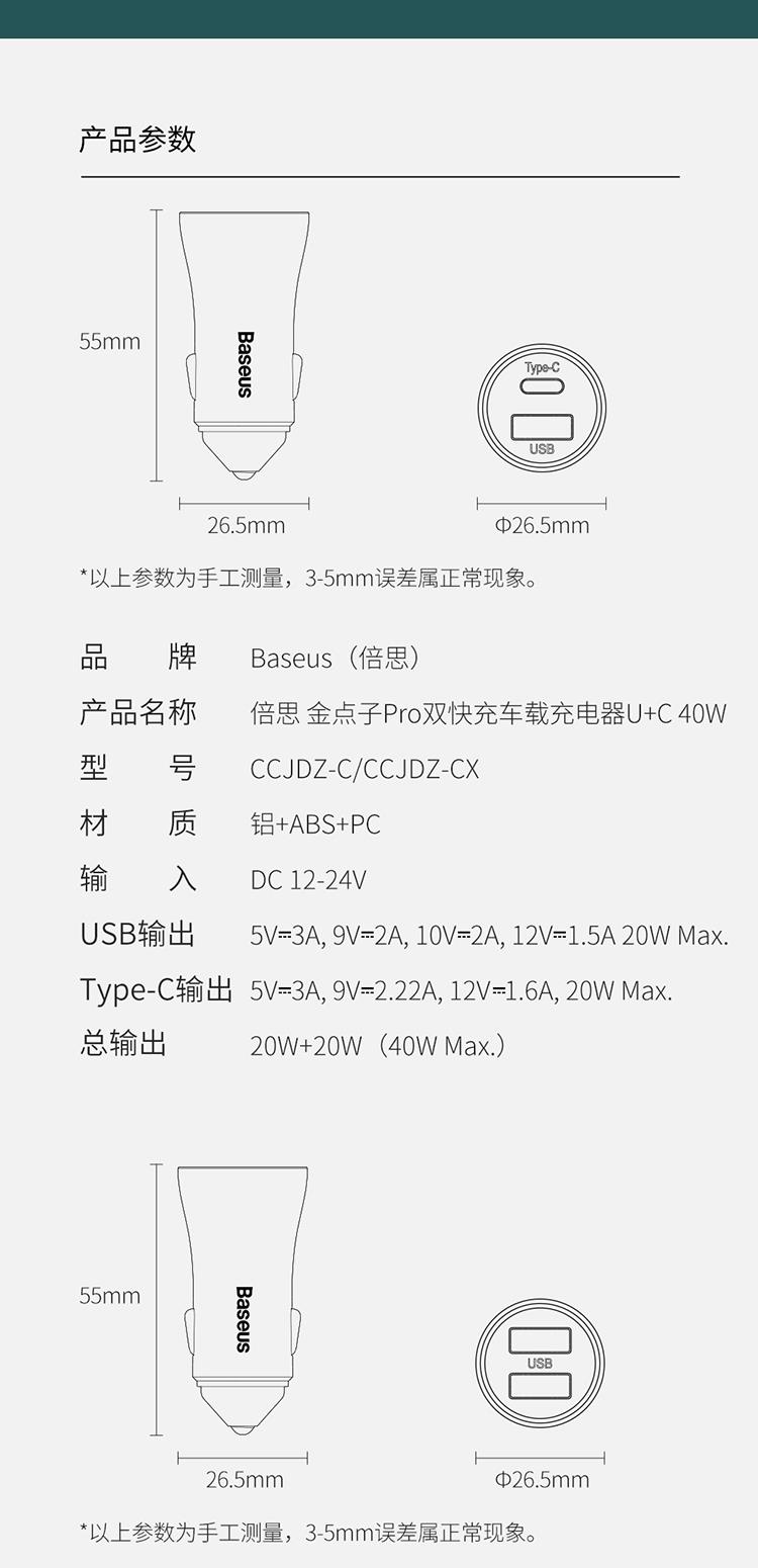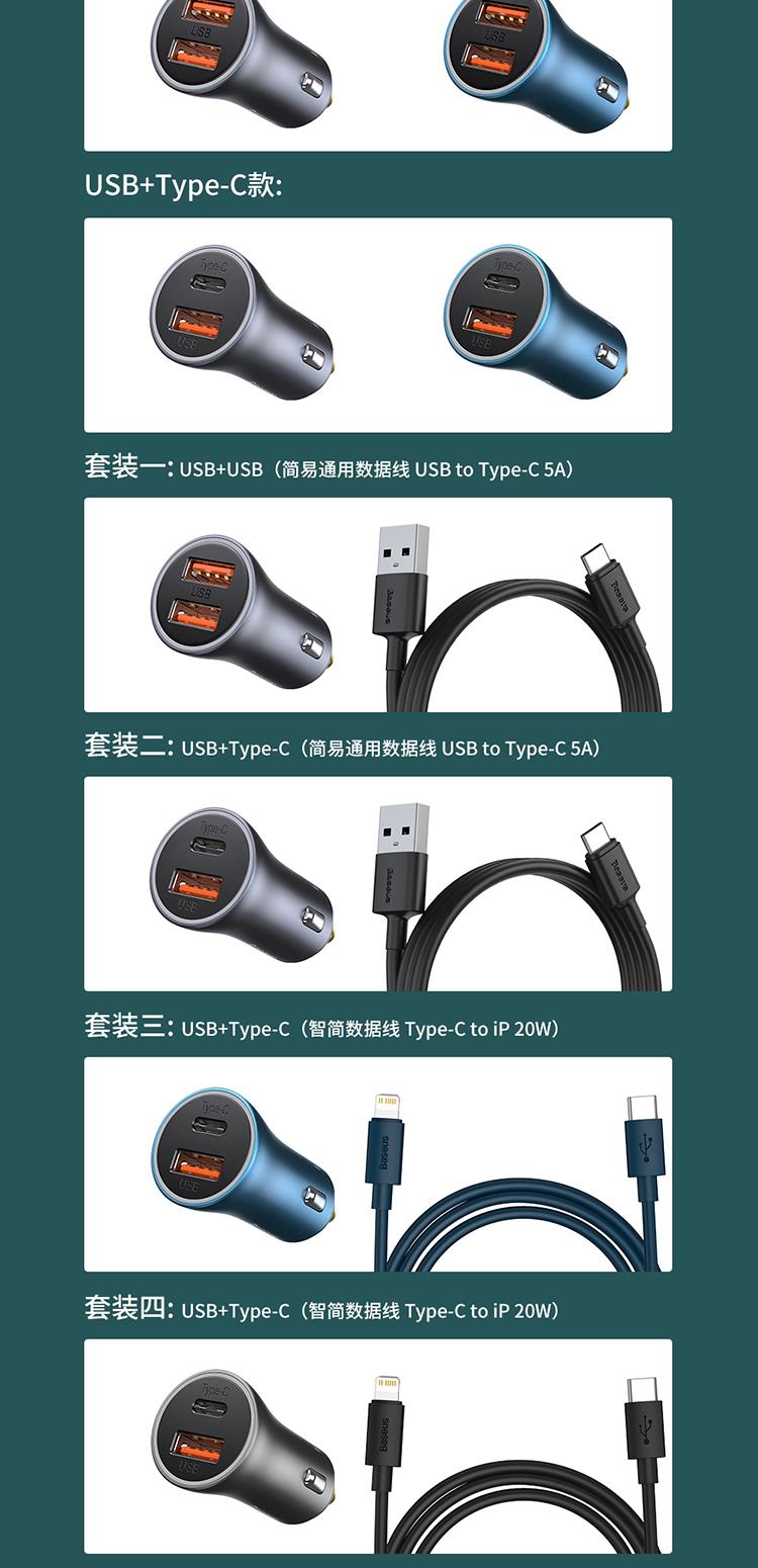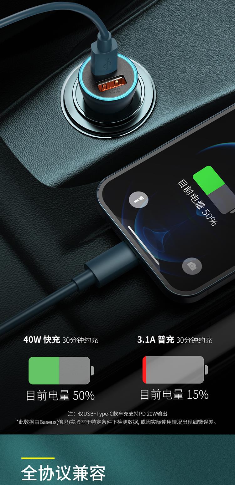 倍思金点子Pro双快充车载充电器40W规格:U+U套装深灰色(含:简易通用数据线USBFORTYPE-C5A1M黑色)