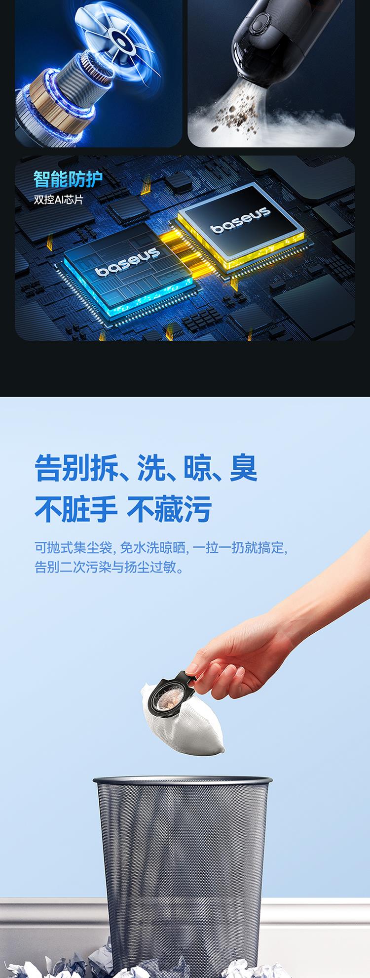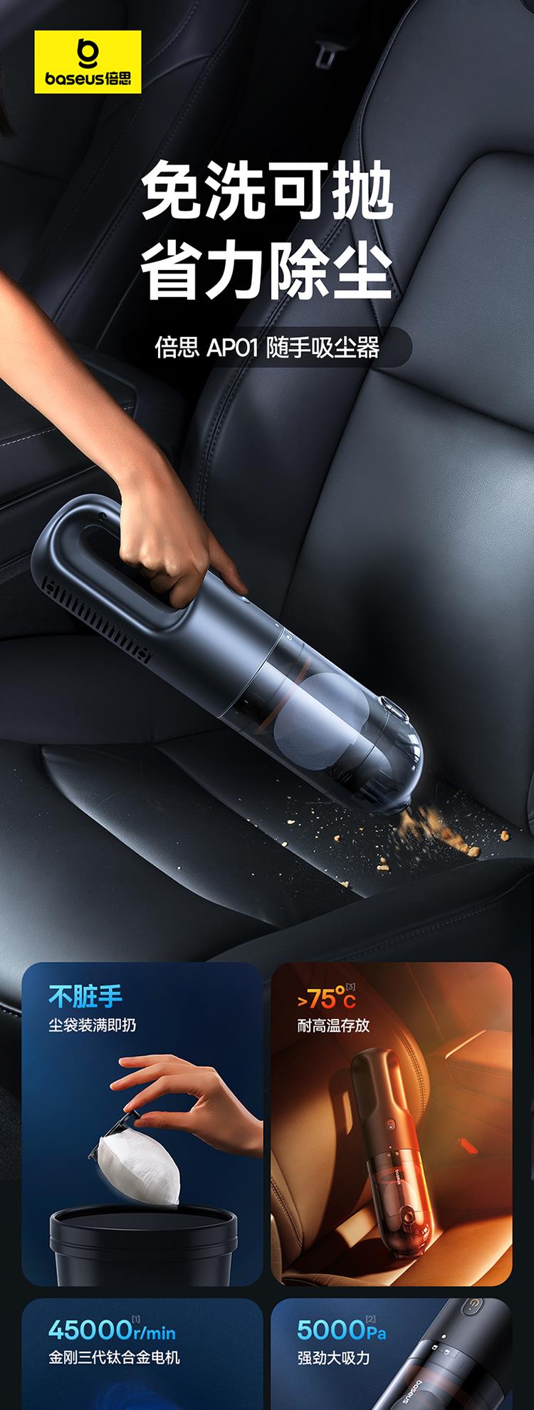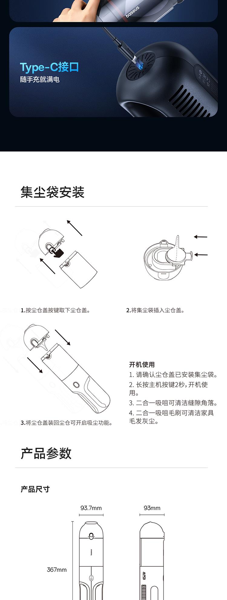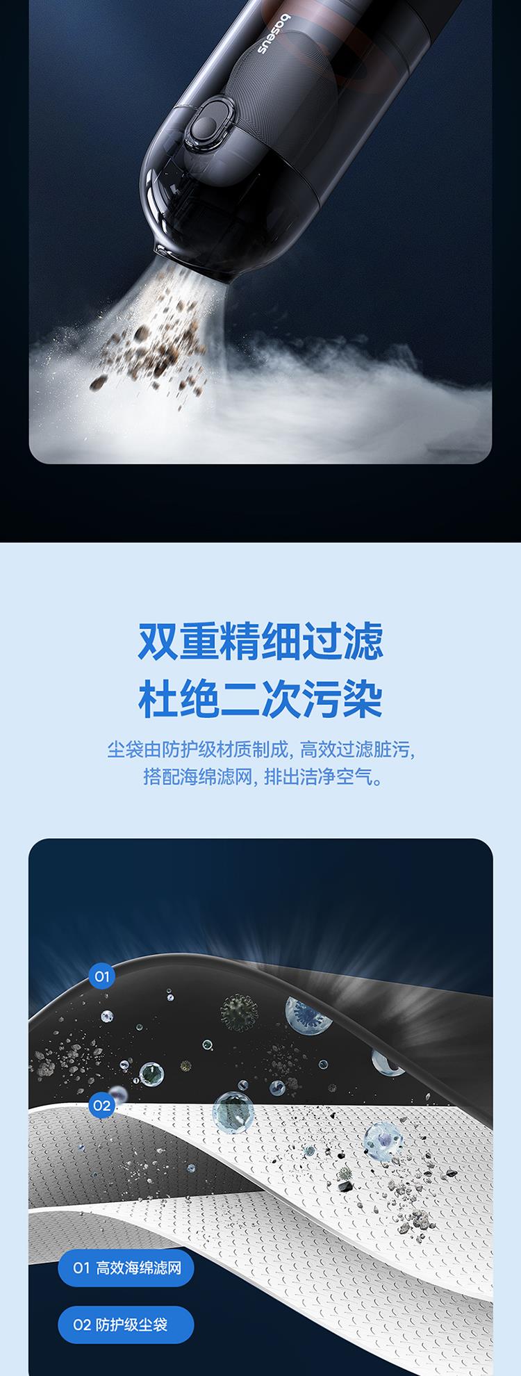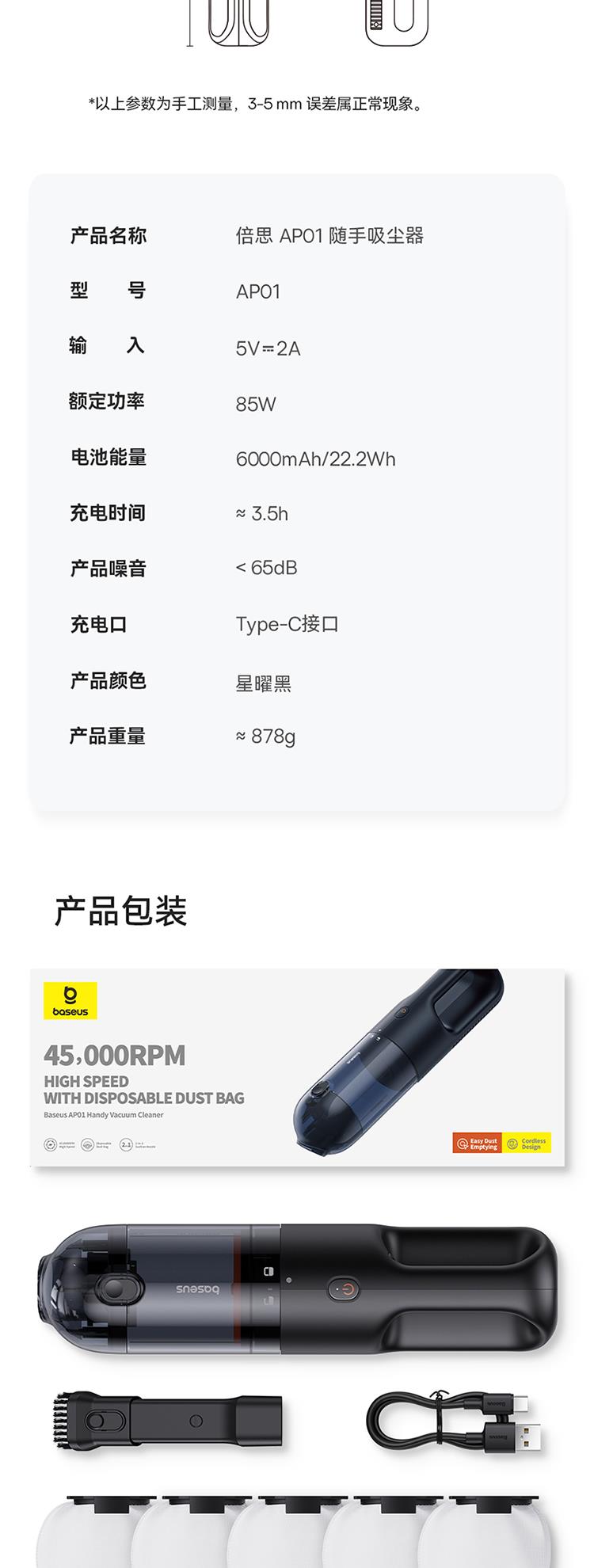 倍思AP01随手吸尘器5000pa(含:二合一吸咀*1/尘袋*15/数据线*1)颜色:星曜黑 C30450100111-00