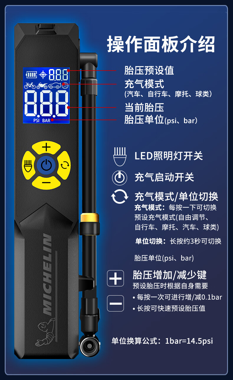 米其林数显便携升级款无线锂电充气泵 可预设胎压