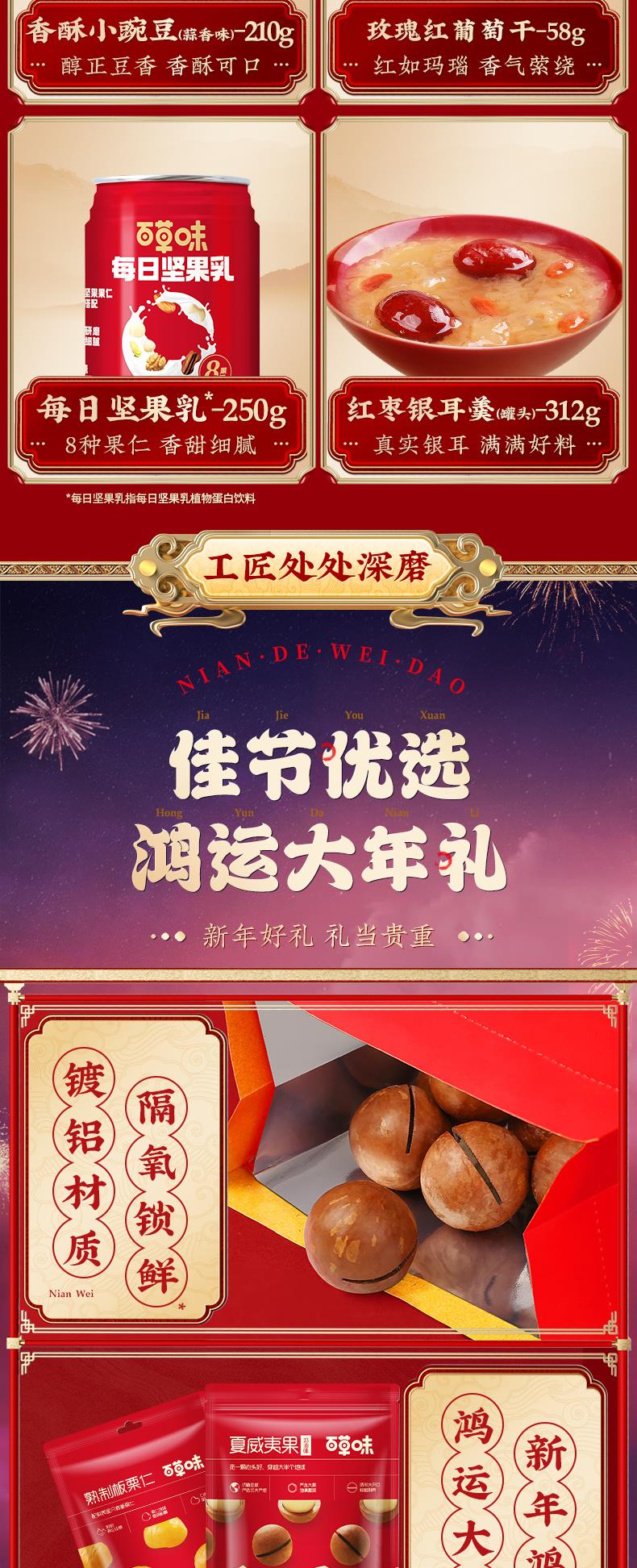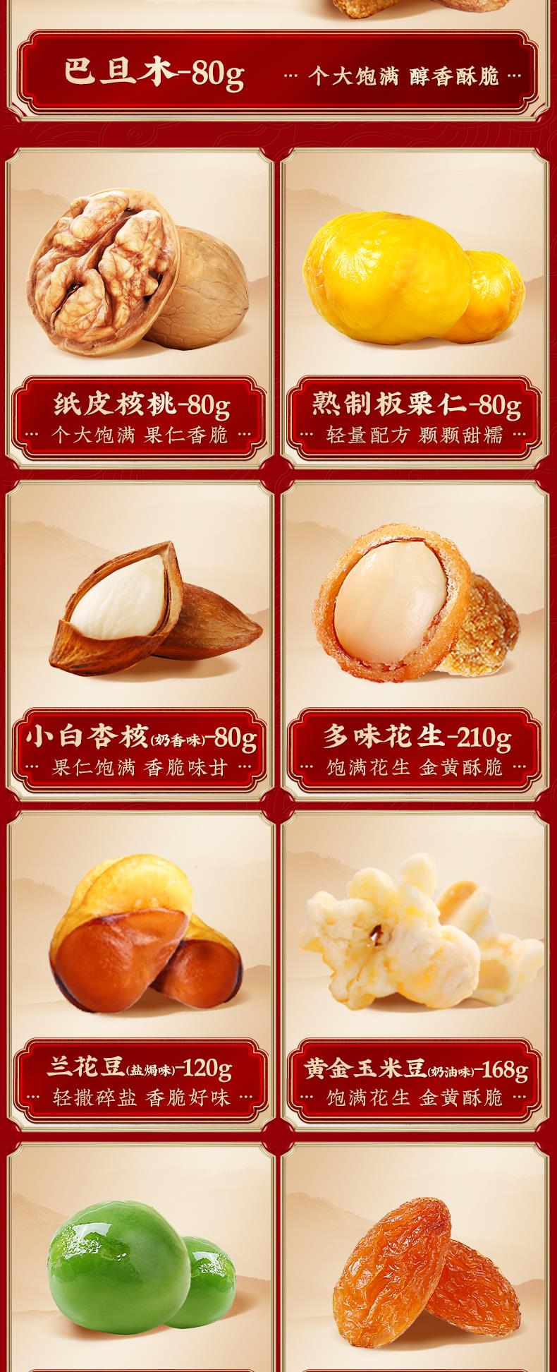 巴旦木(奶油味)80g/夏威夷果(奶油味) 80g/【百草味】小白杏核(奶香味)80g/【百草味】纸皮核桃 80g/【百草味】熟制板栗仁 80g/【百草味】多味花生 210g/【百草味】香酥小豌豆(蒜香味) 210g/【百草味】兰花豆(盐焗味)120g/【百草味】玫瑰红葡萄干 58g/【百草味】黄金玉米豆(奶油味)168g/【百草味】每日坚果乳 250g/【百草味】红枣银耳羹312g